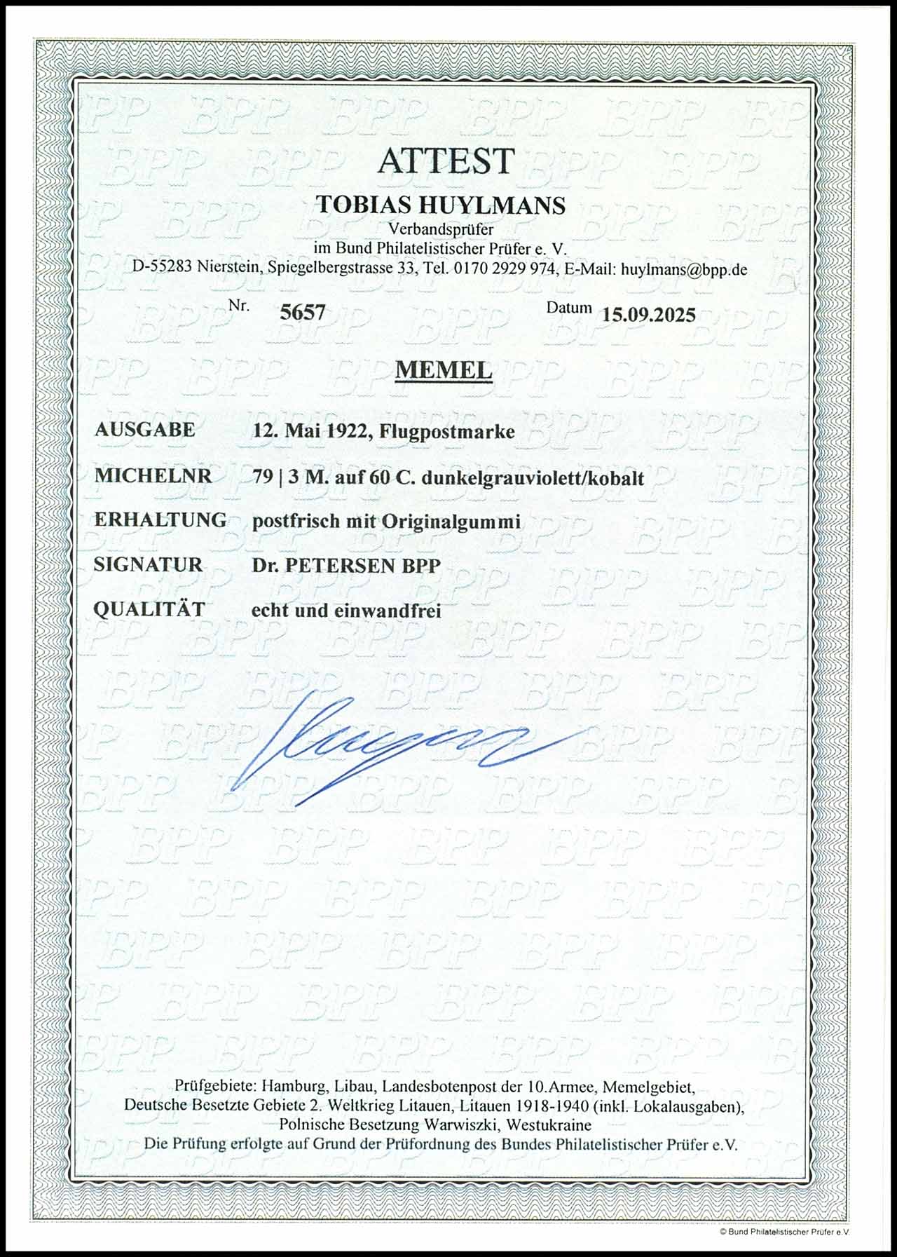 3 M. on 60 C. airmail, original stamp Michel number 37 b, mint never hinged, very fine, issued only 7.500 piece, one stamp the often is absent, expertized Dr. Petersen BPP, photo expertize Tobias Huylmans BPP (2025) "perfect", Michel 500.-