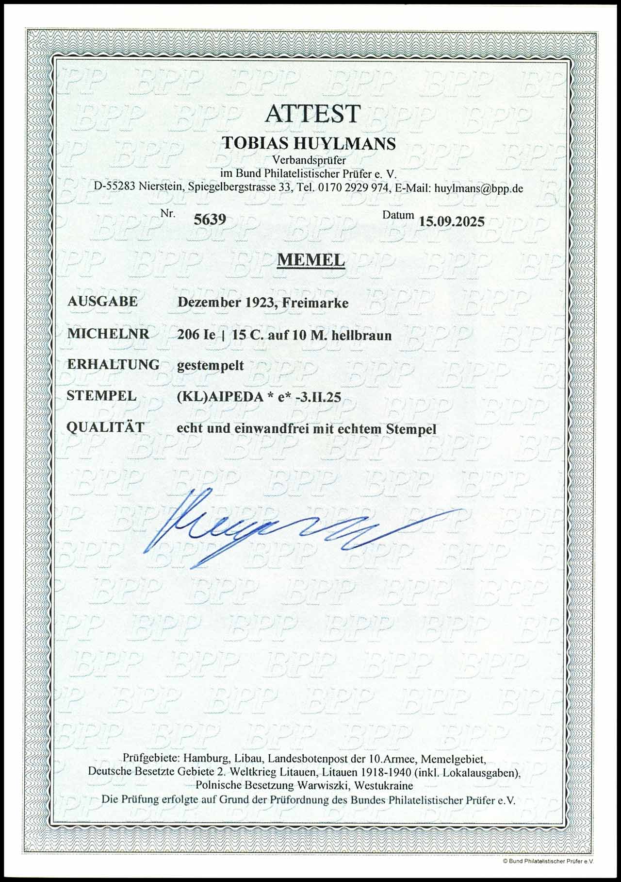 15 cent on 10 Mark pale brown, overprint type Ie, cancelled "KLAIPEDA * e * -3.11.25", very fine, photo expertize Tobias Huylmans BPP (2025) "perfect", Michel 300.-