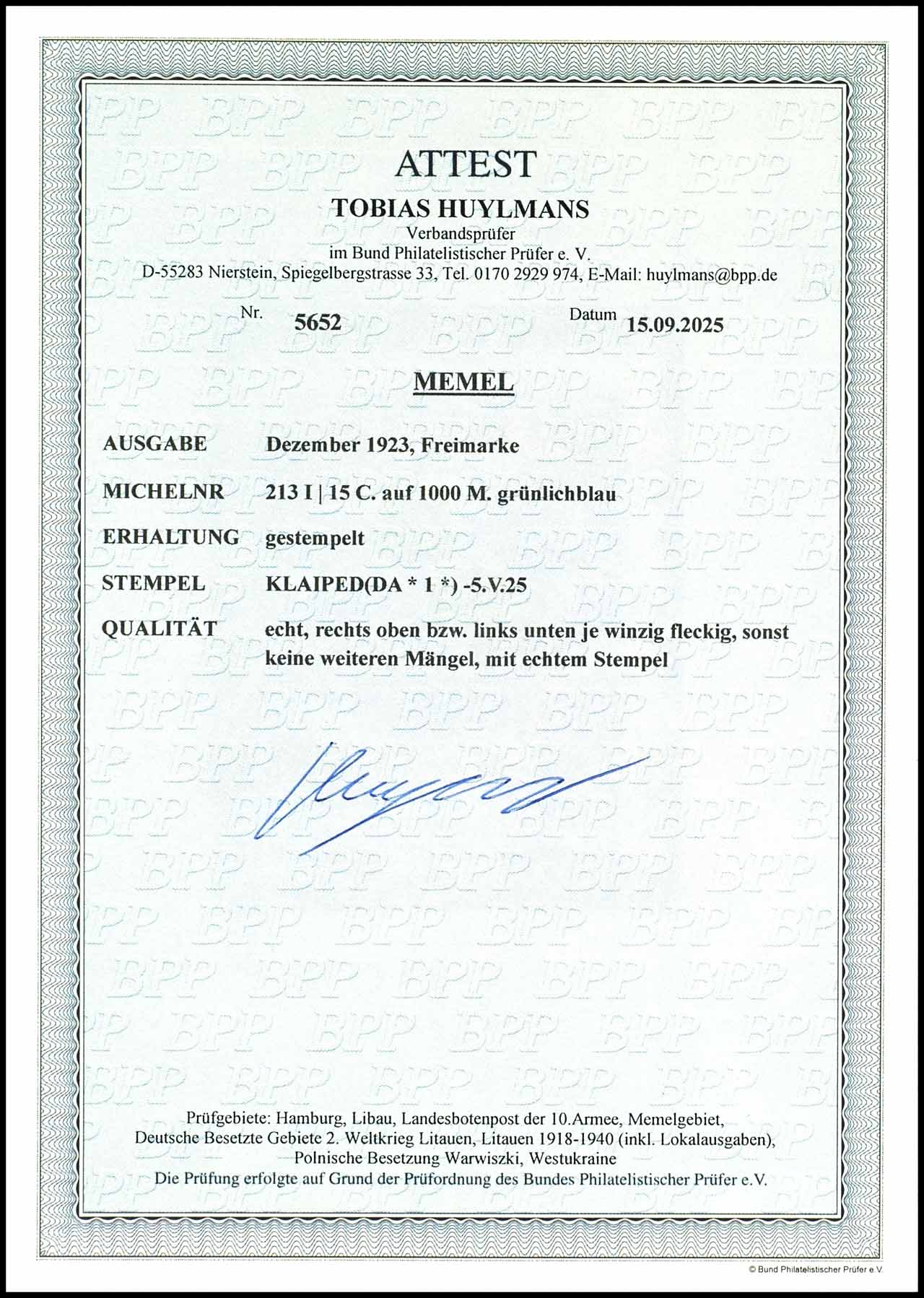 15 C. on 1000 Mark greenish-blue, cancelled "KLAIPEDA * 1 * -5. V. 25", tiny stained - barely visible, photo expertize Tobias Huylmans BPP (2025)