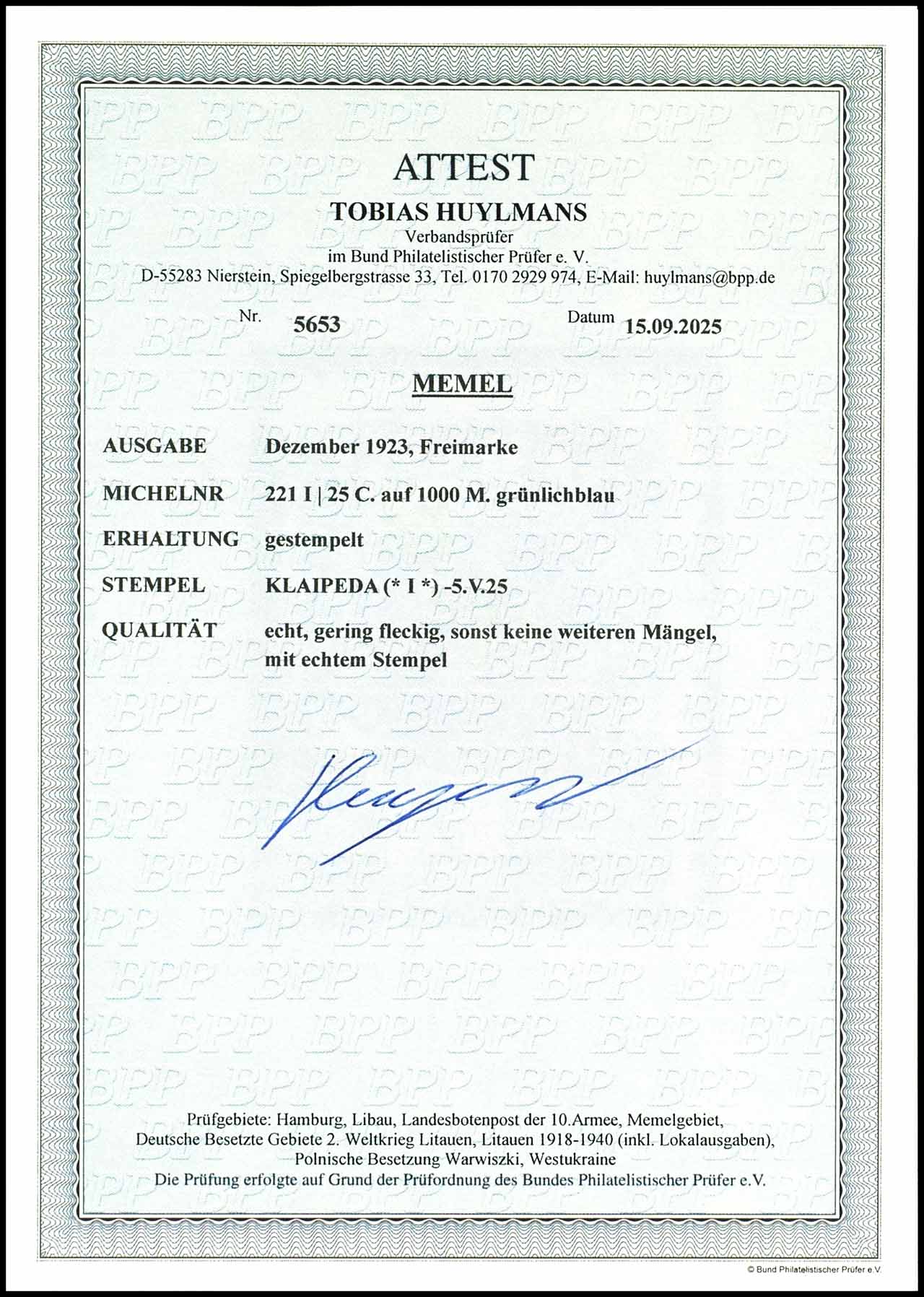 25 C. on 1000 Mark greenish-blue, cancelled "KLAIPEDA * 1 * -5. V. 25", tiny stained - barely visible, photo expertize Tobias Huylmans BPP (2025)