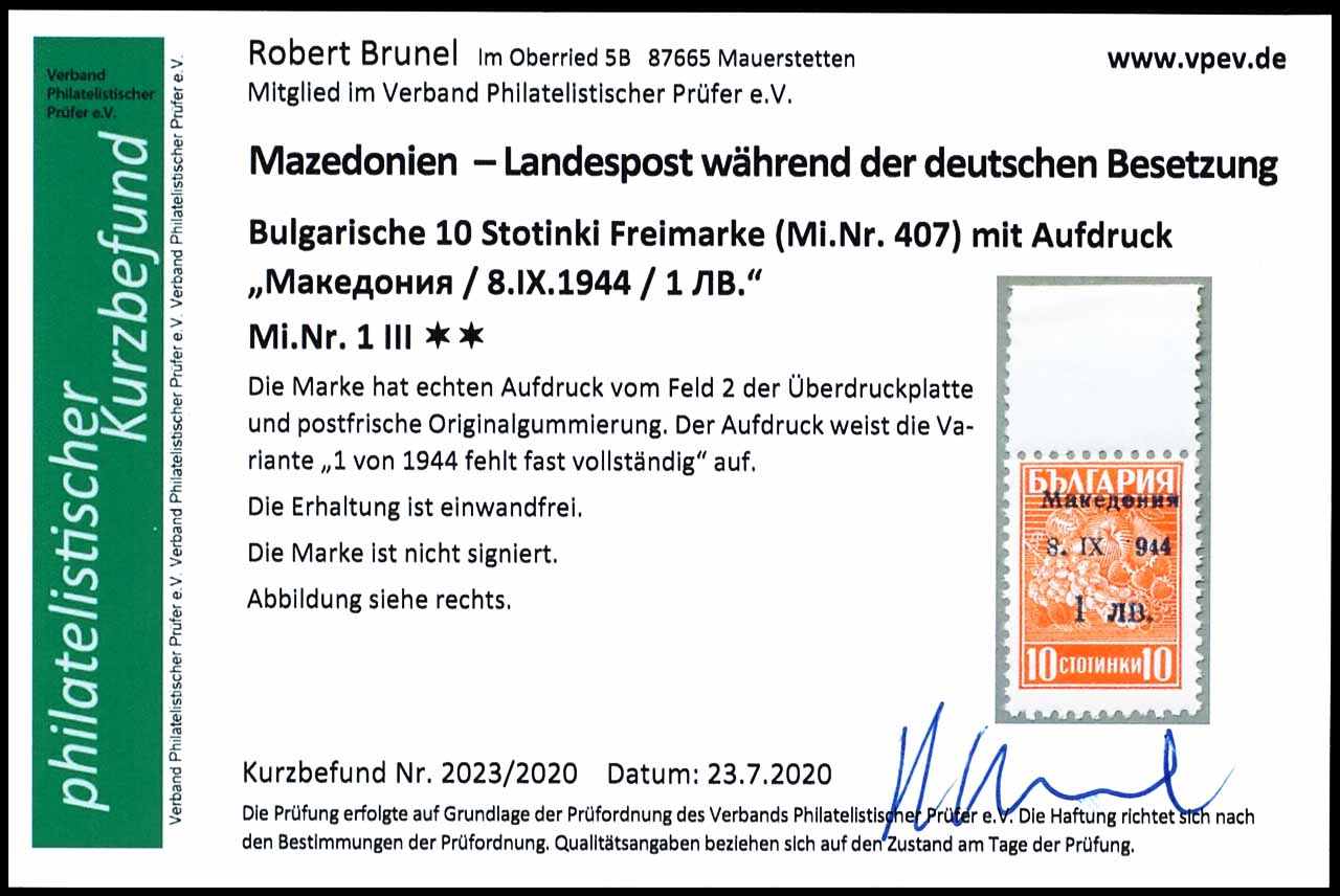 1 levs on 10 Stot postal stamp with overprint in type II, overprint flaw III "missing 1 in 1944", mint never hinged, very fine, unsigned, photo expertize Robert Brunel VP "the condition is perfect. ", Michel 130.-