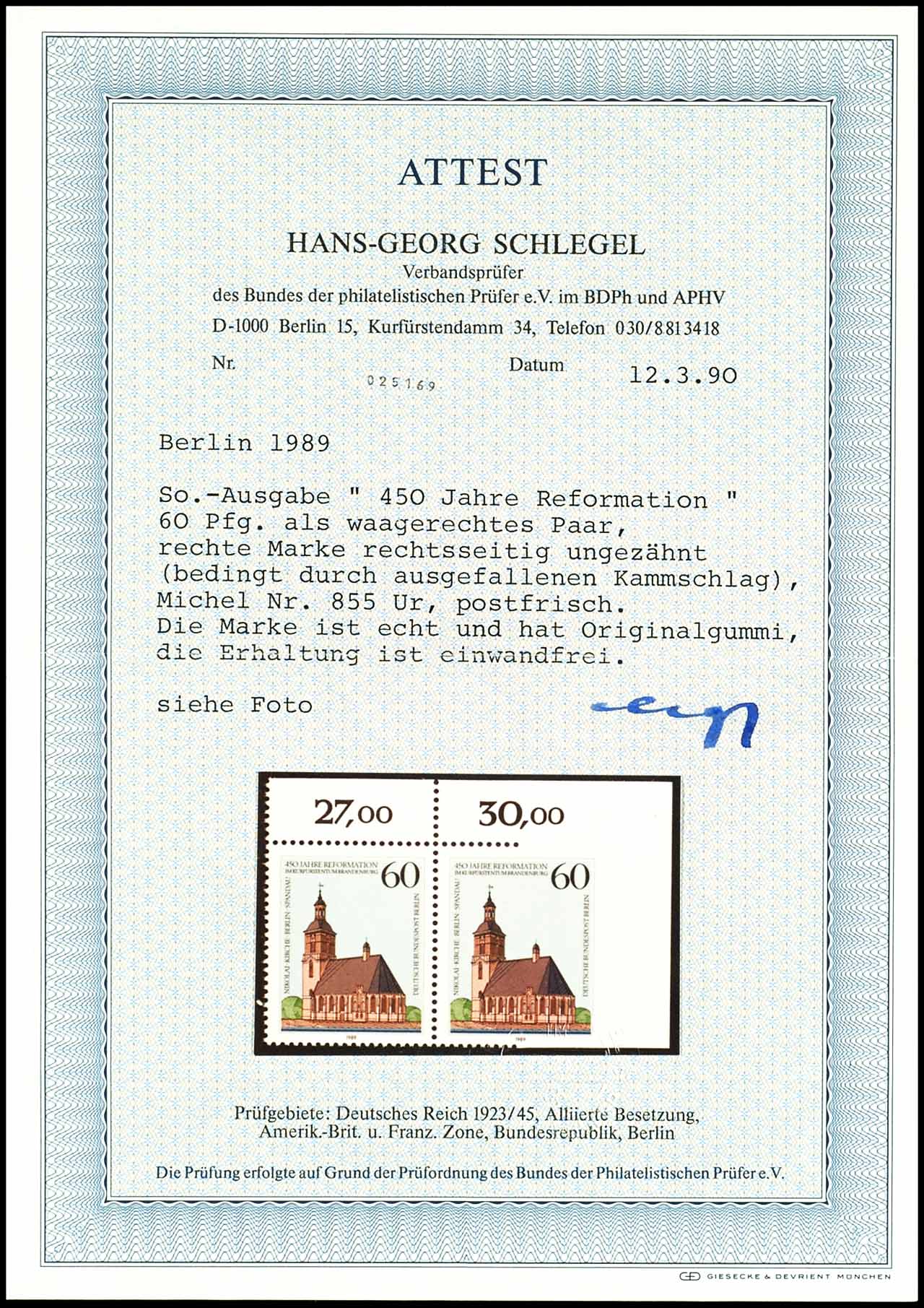 60 pfennigs 450. anniversary of the Reformation in the electorate Brandenburg, right imperforated, corner margin piece top right, in a horizontal pair with normal stamp, perfectly mint never hinged, unsigned, in this kind especially decorative, photo expertize Schlegel BPP "the condition is perfect. ", Michel 1.000.-