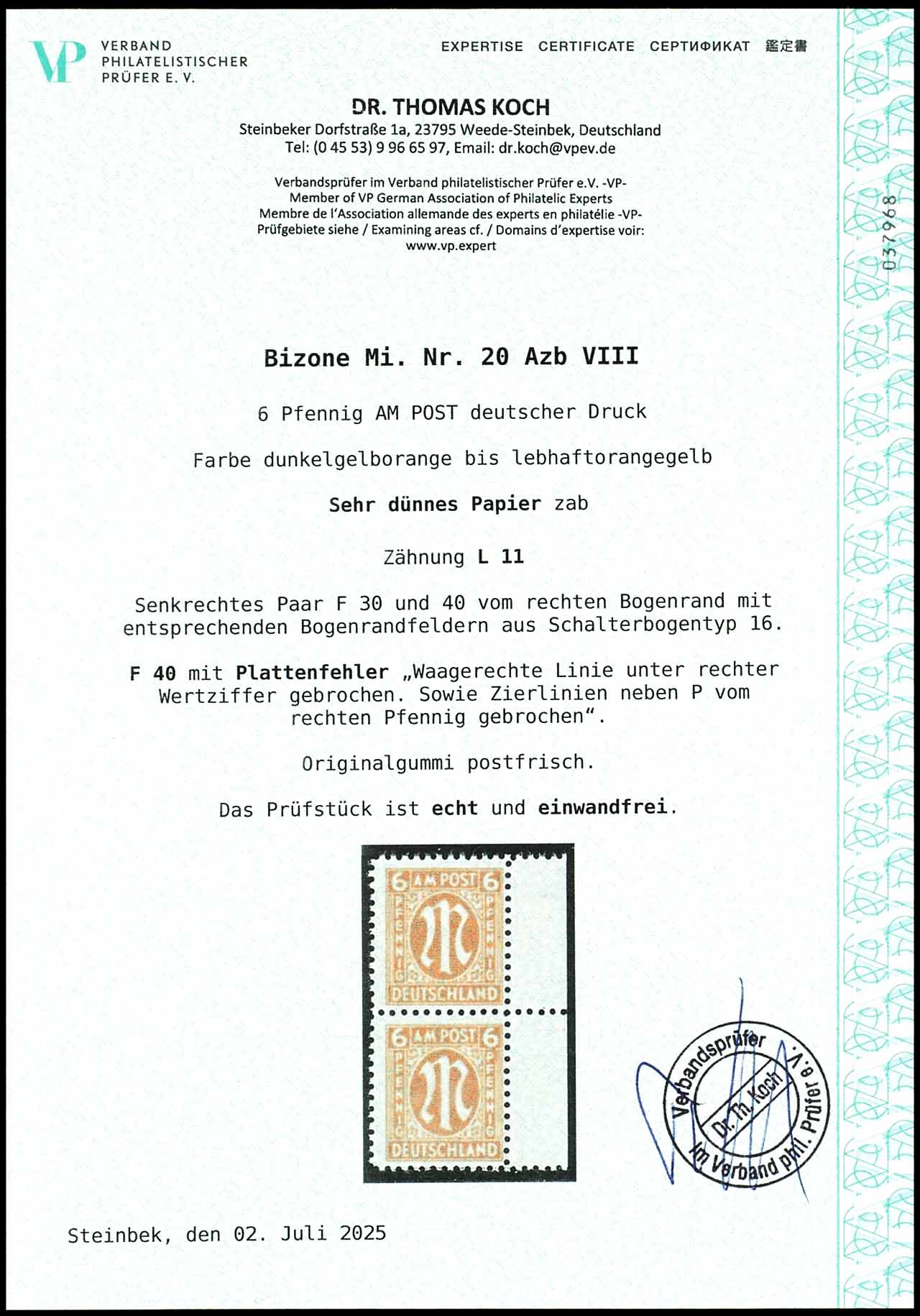 6 pfennigs first issue of stamps for Germany after WW II., German printing, yellow orange, very thin paper, vertical pair from right margin of sheet the fields 30 / 40 from counter sheet type 16, plate flaw on field 40 "horizontal line under right numeral of value broken. as well decorative lines besides P from right pfennigs broken", mint never hinged, very fine, expertise Dr. Thomas Koch VP (2025) genuine and immaculate"