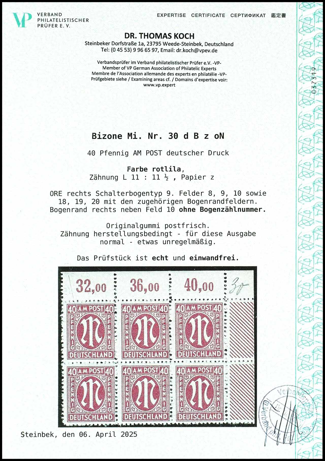 40 pfennigs first issue of stamps for Germany after WW II. German printing, red lilac, perforated L 11 : 11 1 / 2, paper z, counter sheet type 9, corner margin block of six top right (fields 8 / 9 / 10 and 18 / 19 / 20), field 10 in the margin of sheet without sheet counting number, mint never hinged, very fine, expertise Dr. Thomas Koch VP (2025) "genuine and immaculate", Michel 2.200.-
