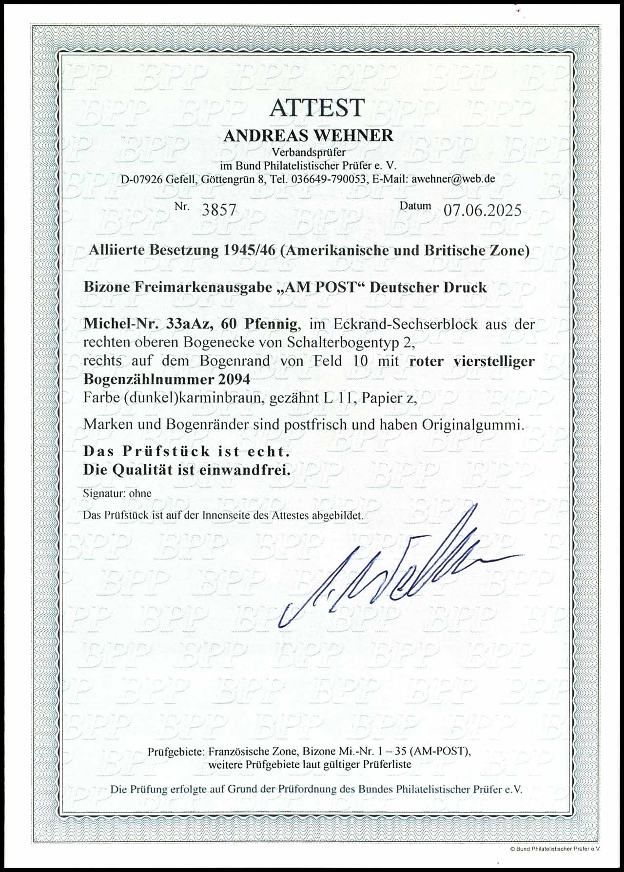 60 pfennigs first issue of stamps for Germany after WW II., German printing, dark carmine brown, perforation L 11, paper z, counter sheet type 2, corner margin block of six top right (field 8-10 / 18-20), besides field 10 red four place sheet counting number "2094", mint never hinged, very fine, photo expertize Andreas Wehner BPP (2025) "the quality is perfect. ", Michel 1.225.-