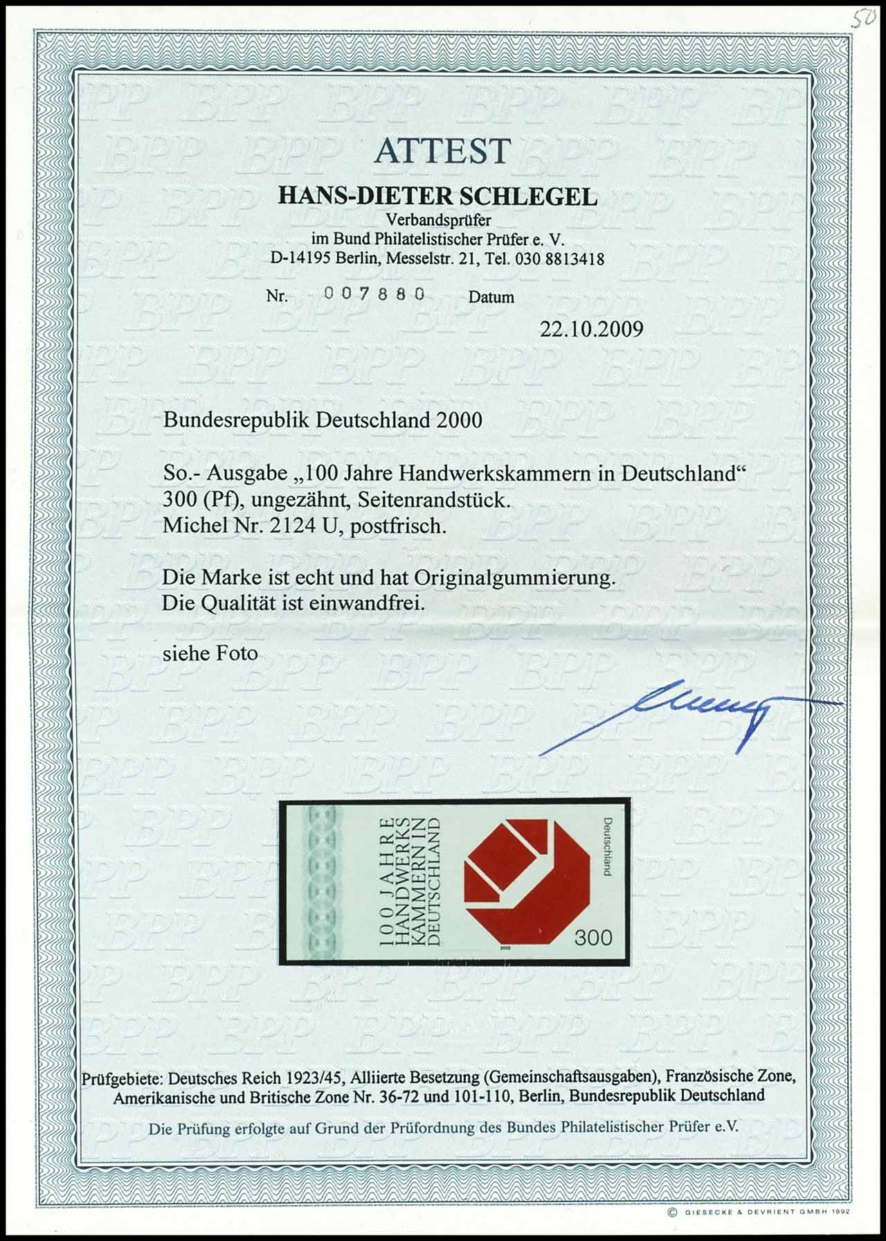 300 pfennigs a hundred years Chamber of Crafts in Germany, imperforated, mint never hinged, very fine, photo expertize Hans Dieter Schlegel BPP "the quality is perfect. "