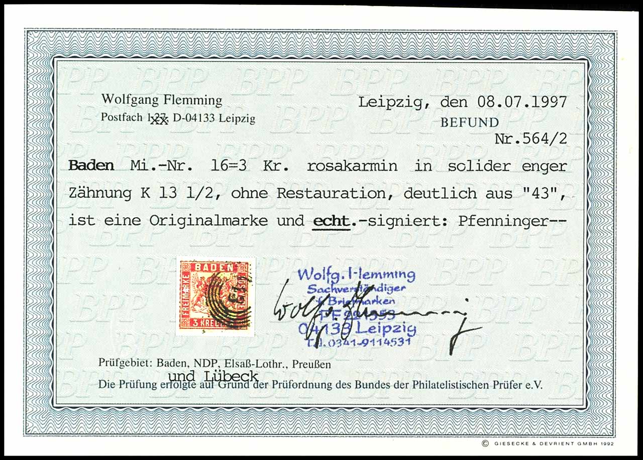 3 Kreuzer rose, perfect perforations and fresh colours extremely fine copy, clear cancelled by numeral postmark "43" - Freiburg, photo expertize Wolfgang Flemming BPP, Michel 350.-