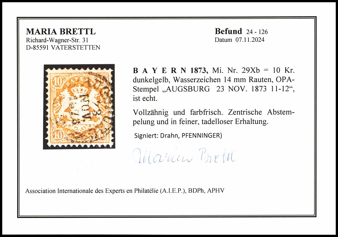 10 Kreuzer dark yellow "close lozenges", fresh colours and perfect perforations extremely fine copy with centric clear mounted single circle postmark AUGSBURG 23 November 1873, expertized Drahn and Pfenniger as well photo expertize Brettl