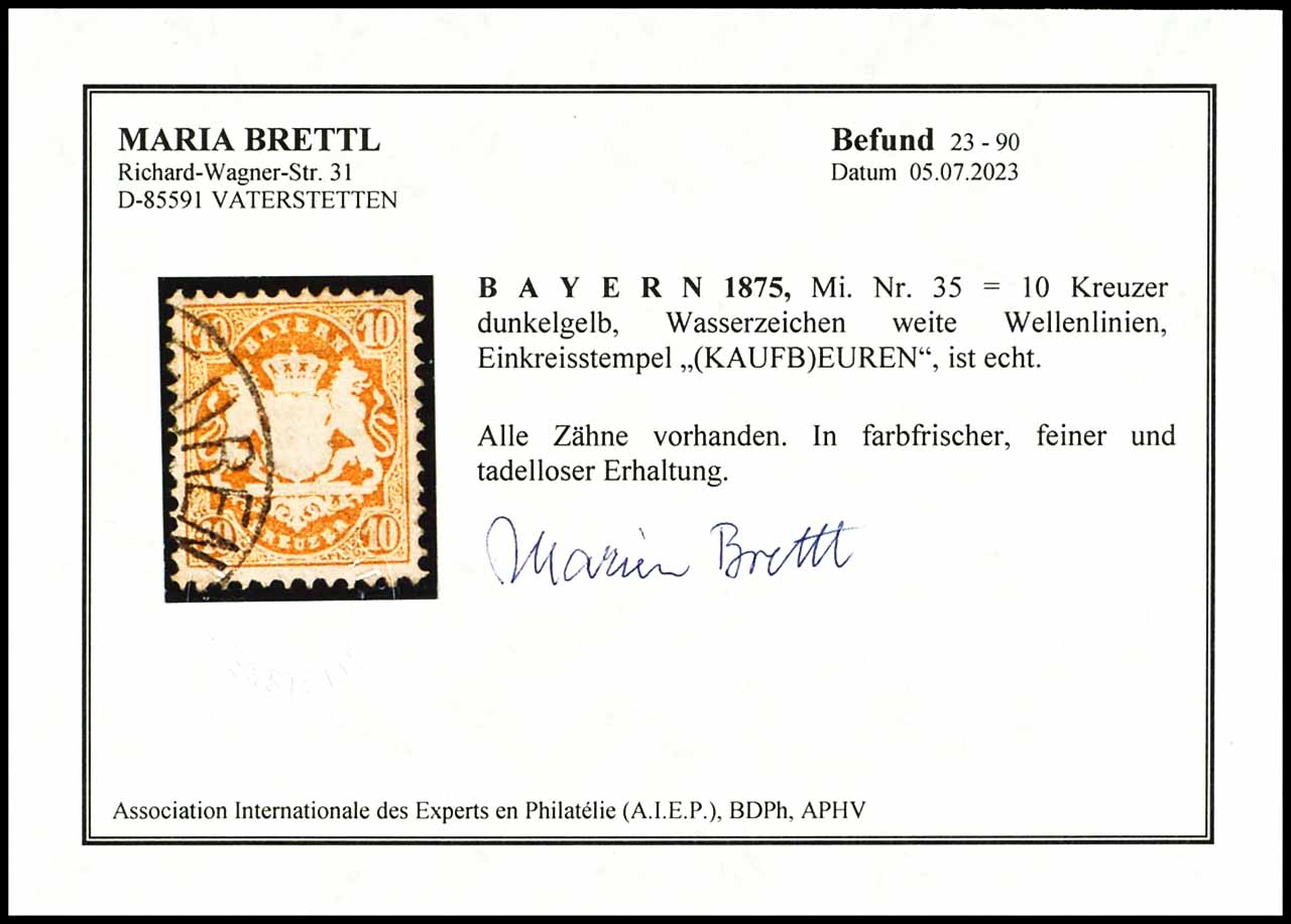 10 Kreuzer dark chrome yellow with very fine clear mounted partial cancel from KAUFBEUREN in fresh colours and complete perforeted choise copy condition, signed as well photo expertize Brettl