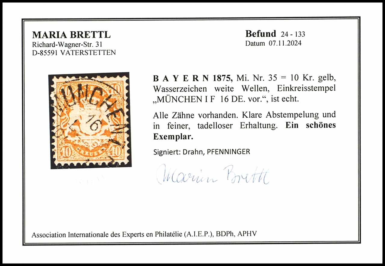 10 Kreuzer dark chrome yellow with centric clear single circle postmark Munich I F 16 DE. in fresh colours and complete perforeted choise copy condition, signed Drahn and Pfenniger as well photo expertize Brettl "a beautiful copy