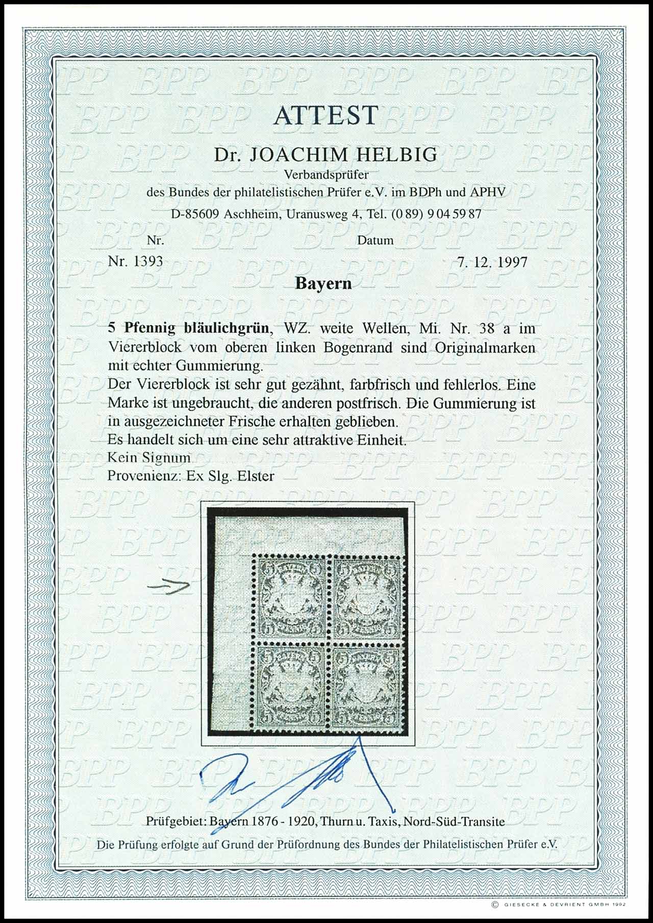5 pfennigs crest issue, bluish green, from corner margin top left, mint never hinged, very fine, photo expertize Dr. Joachim Helbig BPP (for former unit) "fresh colours and flawless
