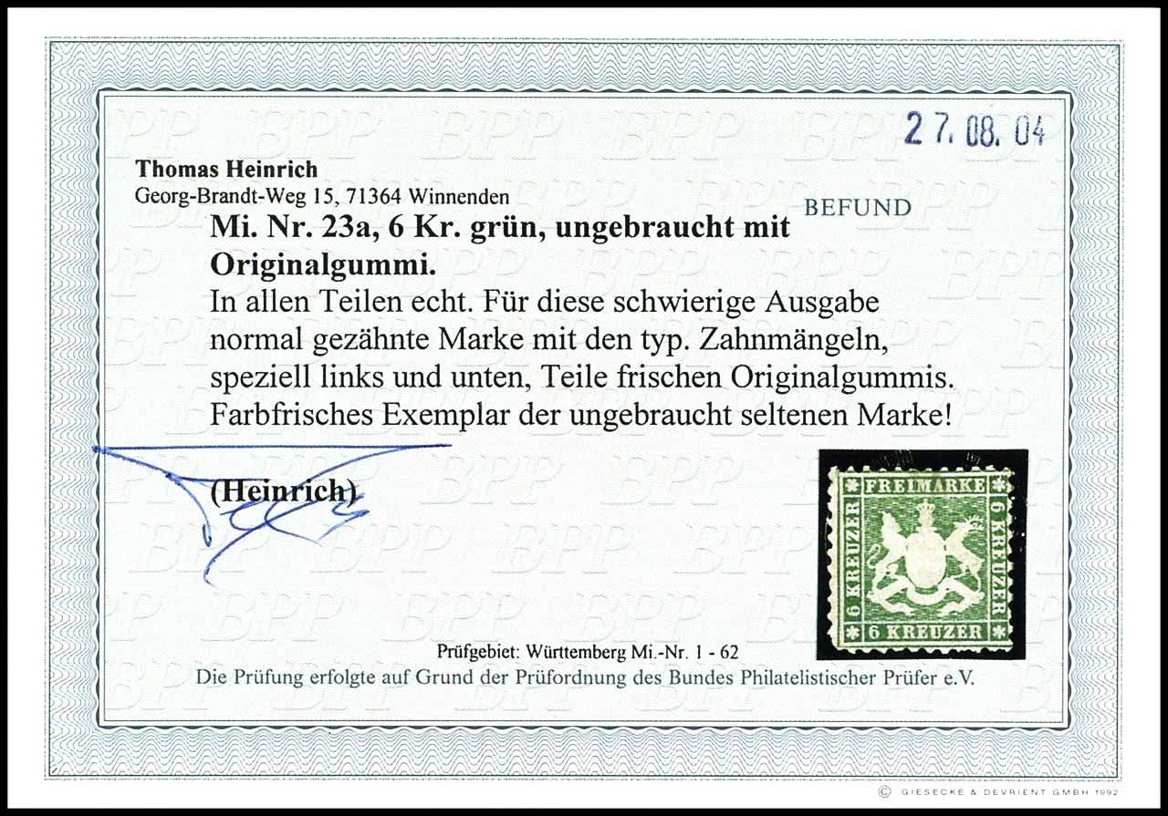 6 Kreuzer green, for this issue normal perforated stamp with the typically perforation defects (special left and at the bottom), unused with parts fresh original gum, photo expertize Thomas Heinrich BPP "fresh colours copy the unused rarely stamp. ", Michel 650.-