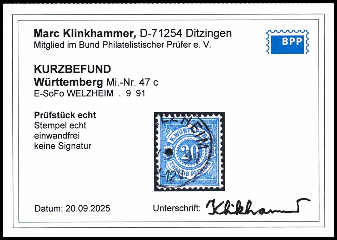 20 pfennigs white numerals in the circle, dark cobalt, neat cancelled "WELZHEIM . 9 91", superb in every respect (choice copy), photo expertize Marc Klinkhammer BPP (2025) "perfect", Michel 300.- - rare stamp!