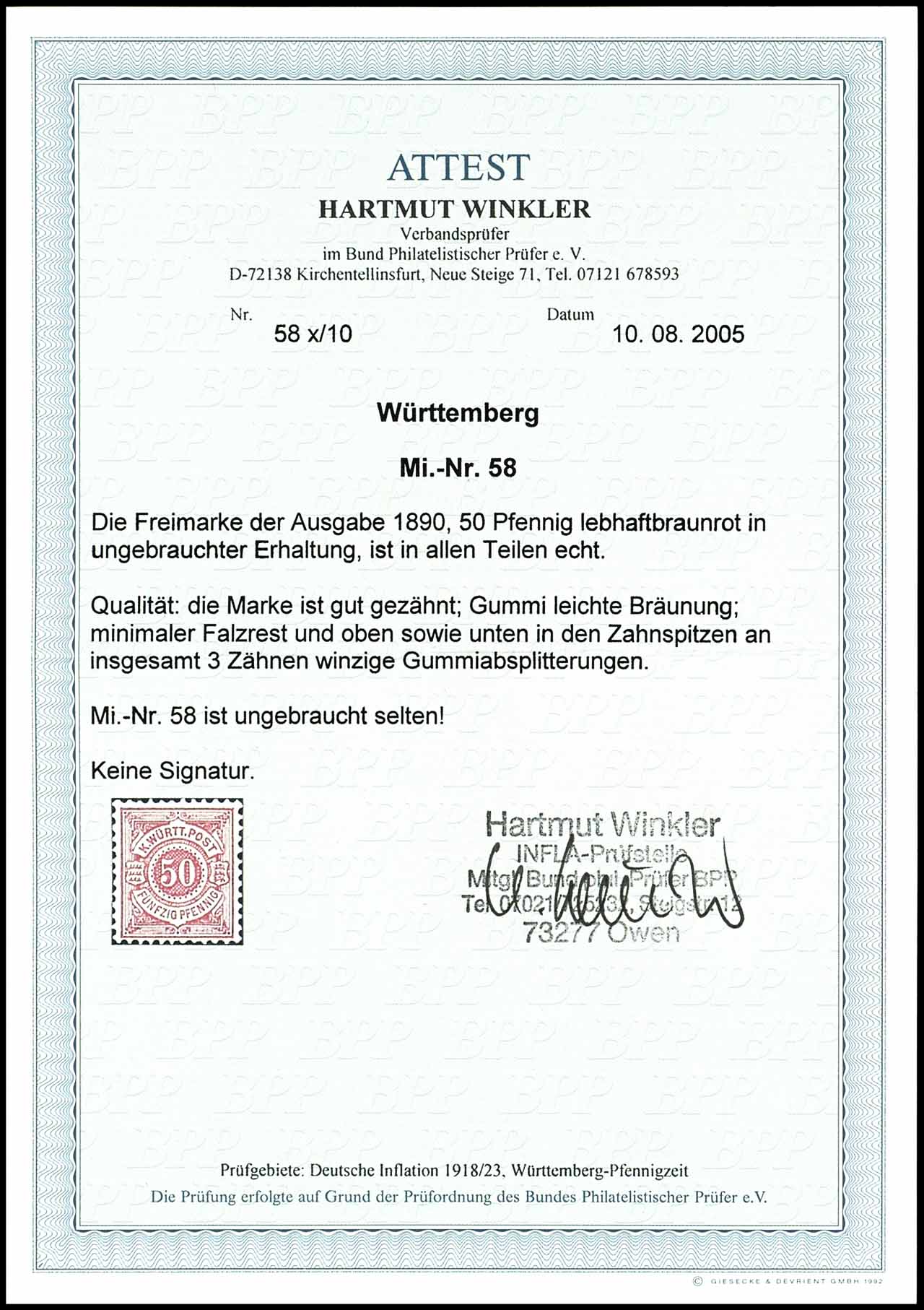 50 pfennigs bright brown red, unused with original gum, well perforated with slight toned gum to the perf tips partly tiny gum splinterings, photo expertize Hartmut Winkler BPP "Michel. number 58 is unused rare.