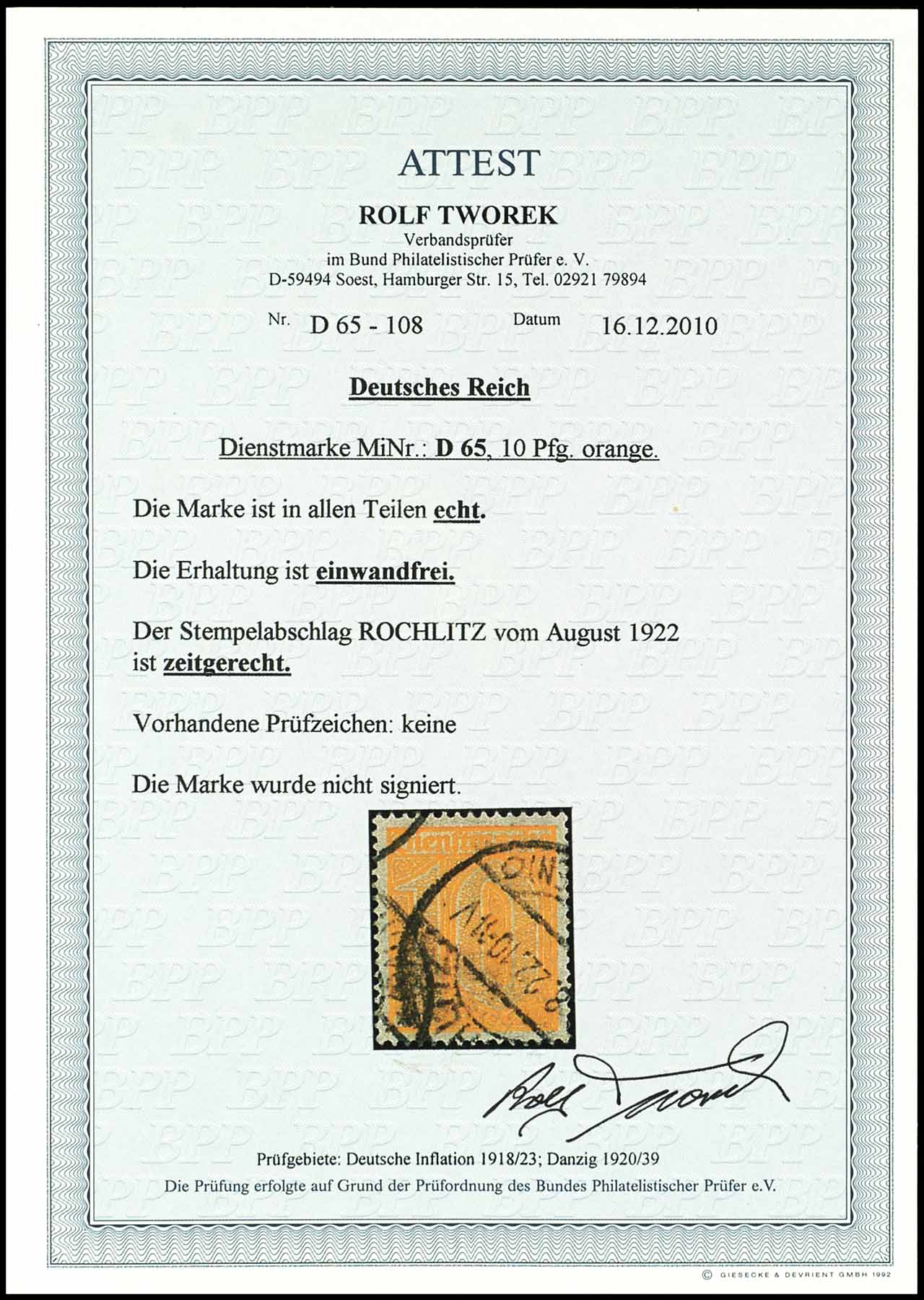 10 pfennigs official stamp, dark orange, cancelled "ROCHLITZ . 8.22 10-11 V", very fine, photo expertize Rolf Tworek BPP, "the condition is perfect. ". Michel 600.-