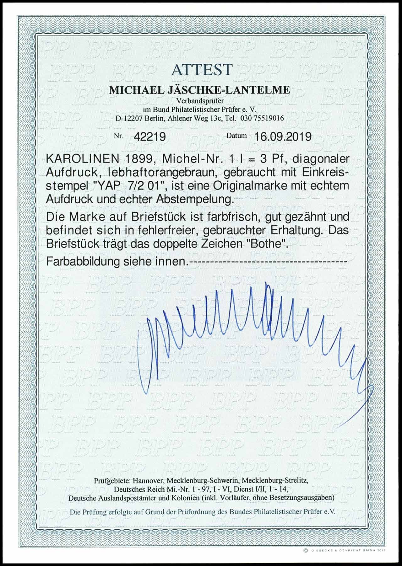 3 pfennigs crown / eagle bright orange brown with black, diagonal typography overprint "Caroline", cancelled by single circle postmark "YAP 7 / 2 01", very fine, expertized Bothe BPP, photo expertize Michael Jaeschke Lantelme BPP "fresh colours, well perforated. in faultless, used condition. ", Michel 850.-