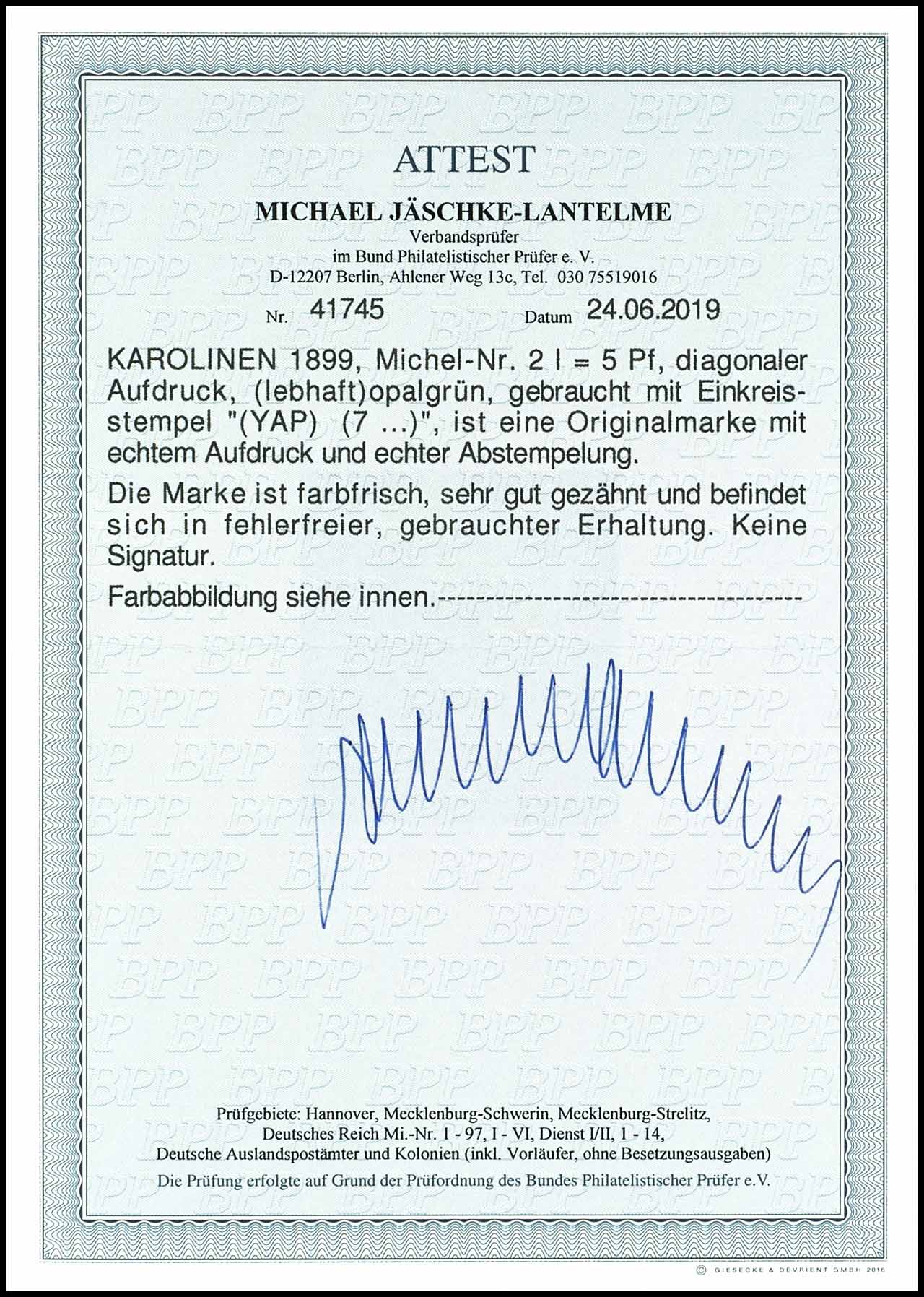 5 pfennigs crown / eagle lively opal green with diagonal typography overprint "Caroline", cancelled "YAP", very fine, unsigned, photo expertize Michael Jaeschke Lantelme BPP "in faultless, used condition. " ; Michel 750.-