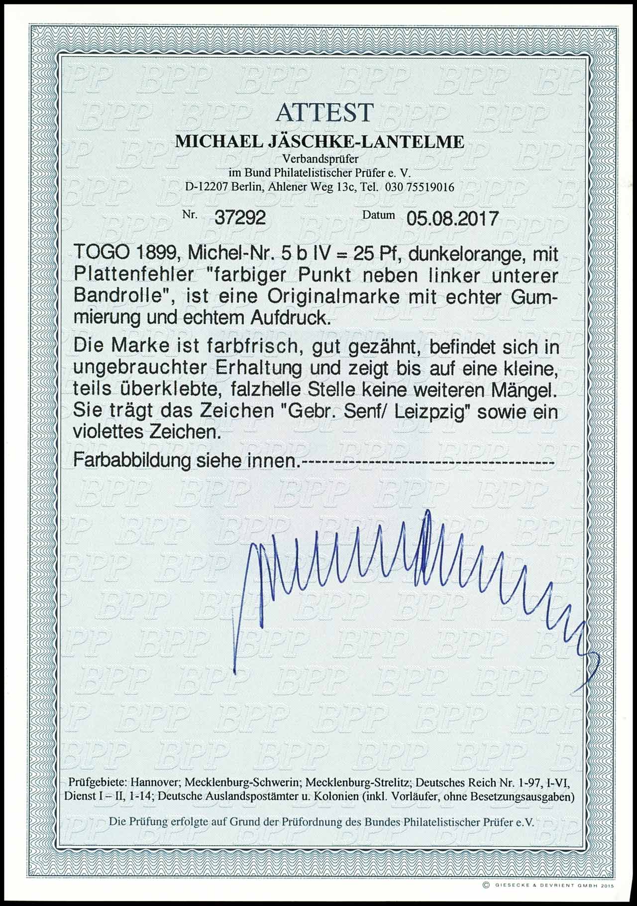 25 pfennigs, dark orange, with overprint Togo, plate flaw "coloured dot besides left lower ribbon roll", unused, photo expertize Jaeschke L. BPP "shows except for one small thin from hinge place no further defects", Michel -, -