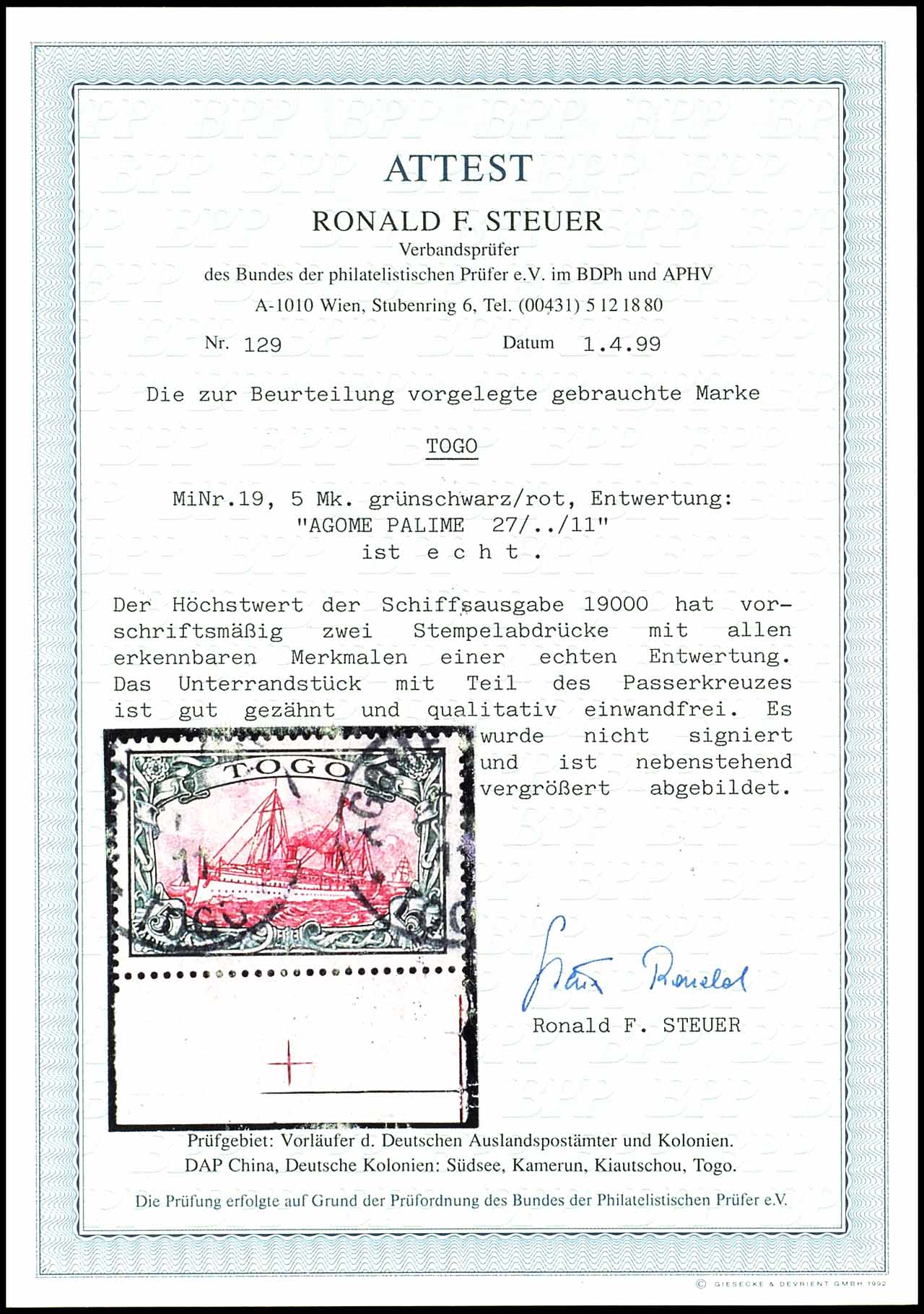 5 Mark, green black / brownish carmine, cancelled lower margin copy with marker cross on margin to facilitate cutting or perforating of panes, very fine, photo expertize Steuer BPP "is qualitatively perfect", Michel 600.- plus plus