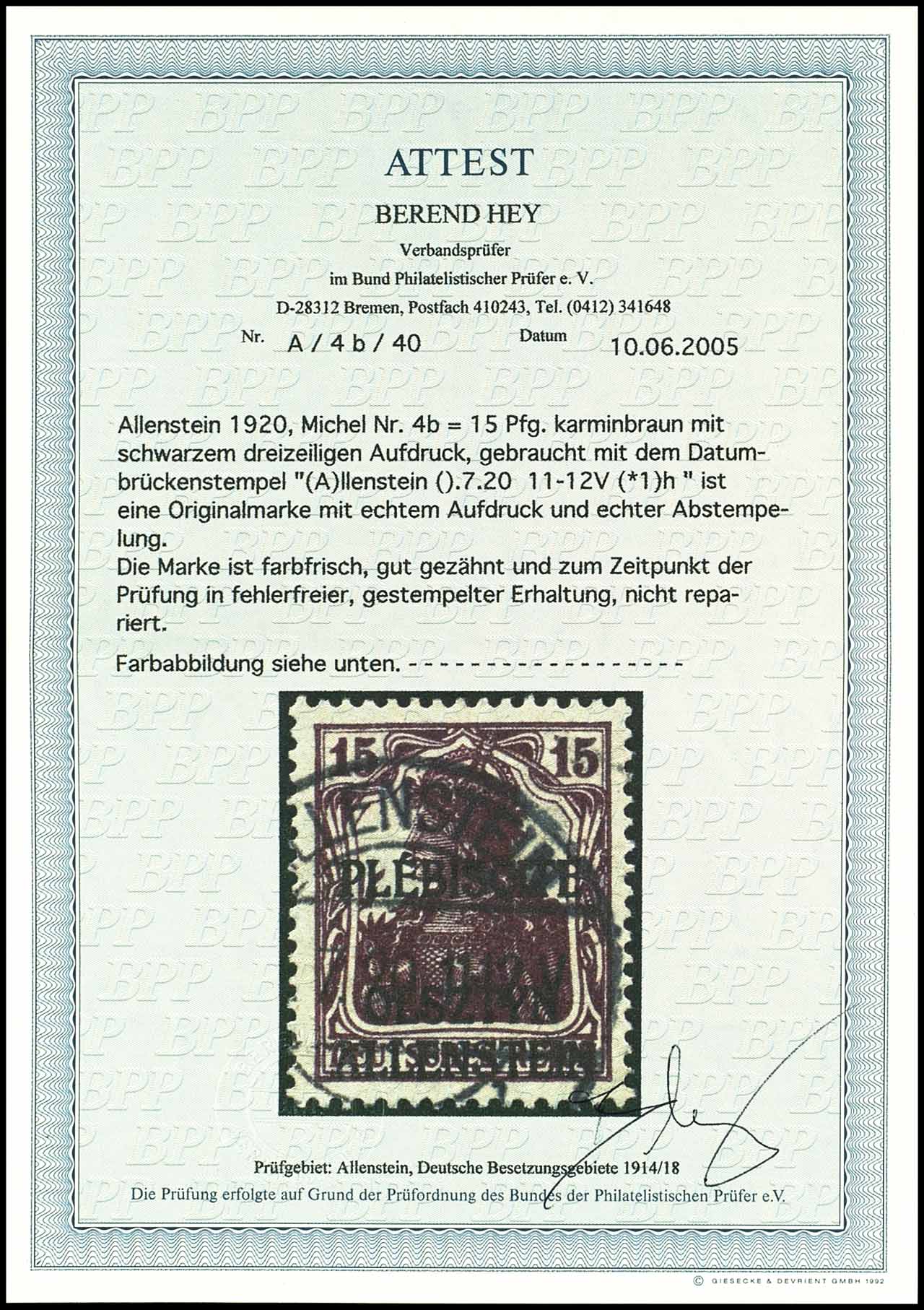 15 pfennigs Germania carmine brown with three line typography overprint, overprint higher standing - so-called victory stamp, neat cancelled "Allenstein . 7.20", very fine, photo expertize Berend Hey BPP