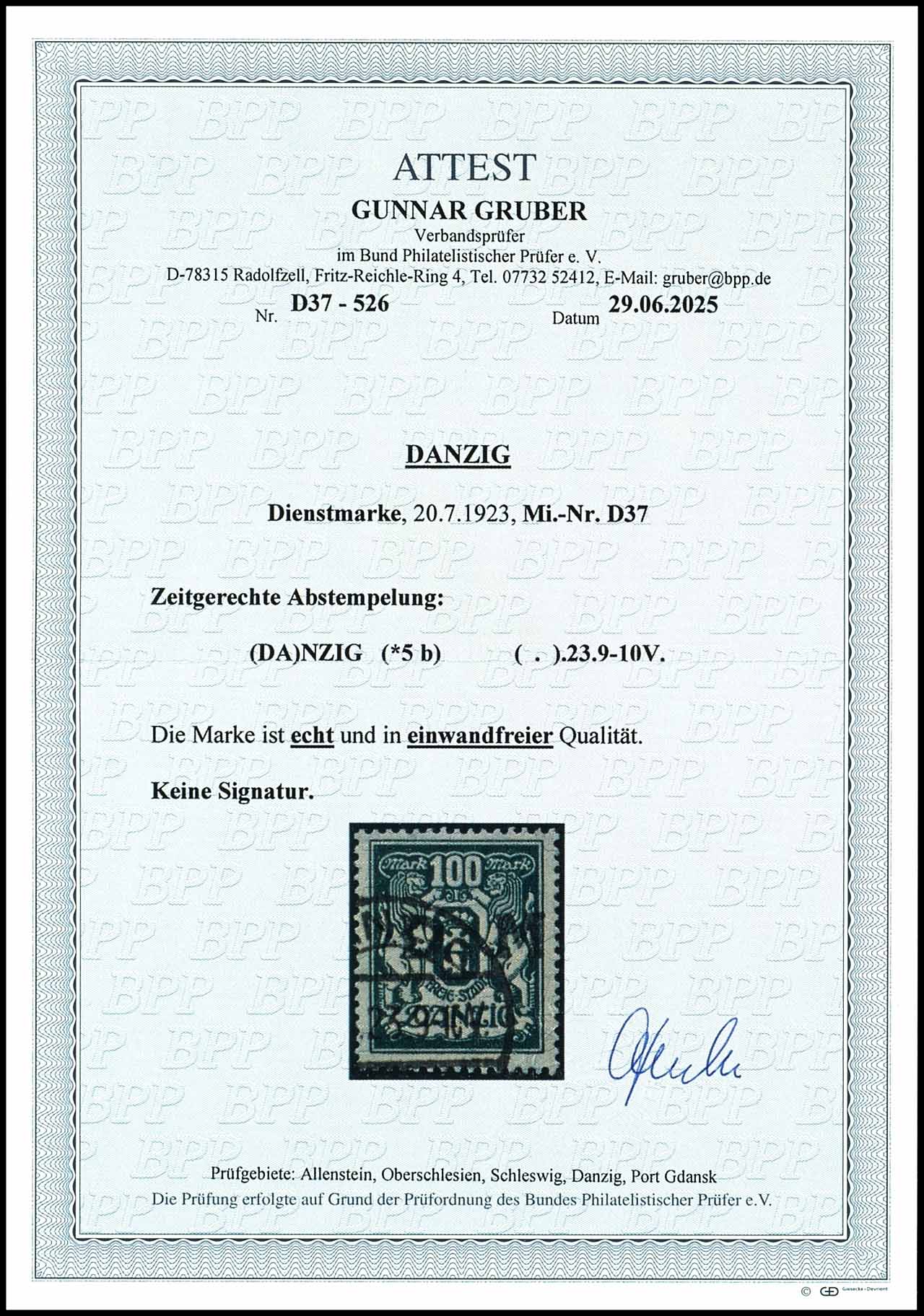 100 Mark large national coat of arms with overprint "D M", date-appropriate cancelled "Gdansk *5 b . 23 9-10 V", very fine, photo expertize Gunnar Gruber BPP (2025) "in perfect quality. ", Michel 550.-