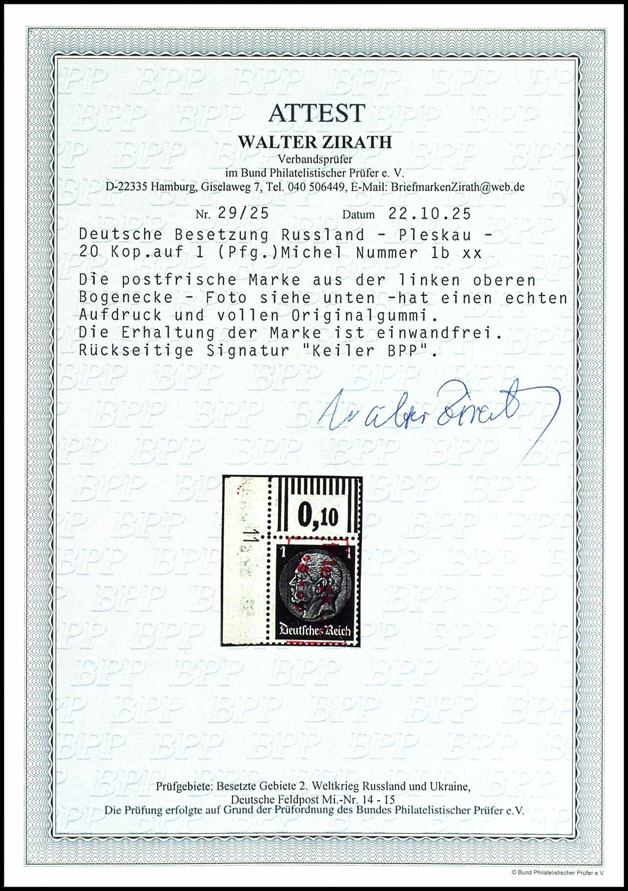 1 pfennigs Hindenburg with red overprint "20 Kop. Pleskau", stamp from the left upper corner! (field 1), mint never hinged, very fine, rare in this form, signed Keiler BPP et alia and photo expertize Zirath BPP (2025) "the condition of the stamp is perfect. ", Michel 550.- plus