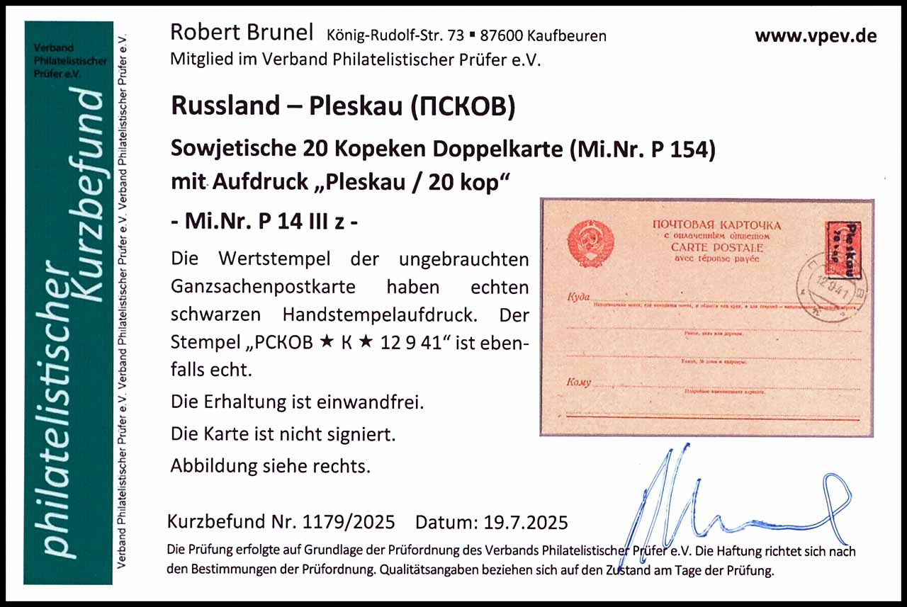 20 Kopecks double postal stationery, folded, with overprint "Pleskau / 20 kop", black hand stamp overprint, blank card, only the question card cancelled by cancel "PCKOB * K * 12 9 41", very fine, photo expertize Robert Brunel VP (2025) " the condition is perfect