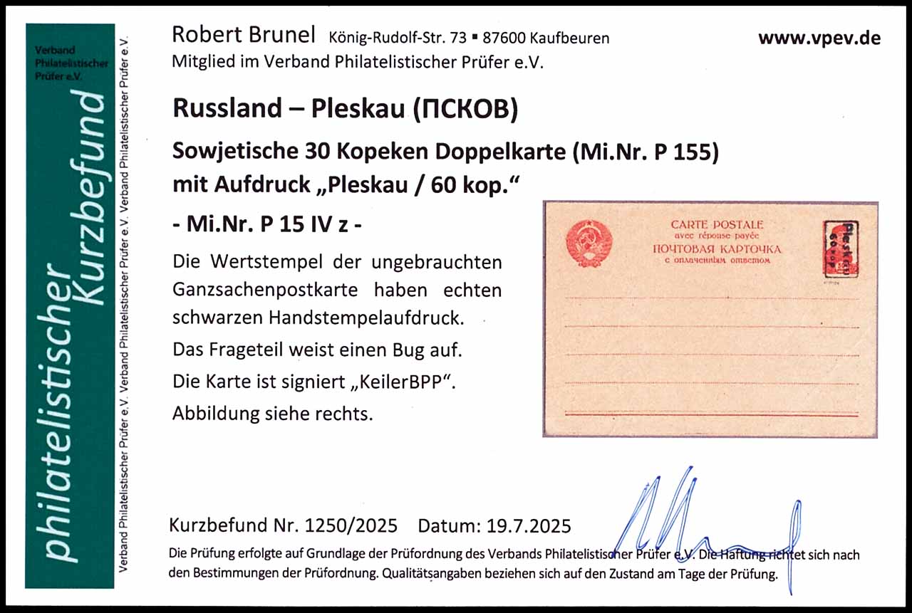30 Kopecks double postal stationery, folded, with overprint "PLESKAU / 60 kop", black hand stamp overprint, unused, crease in the question part, photo expertize Robert Brunel VP (2025), expertized Keiler BPP