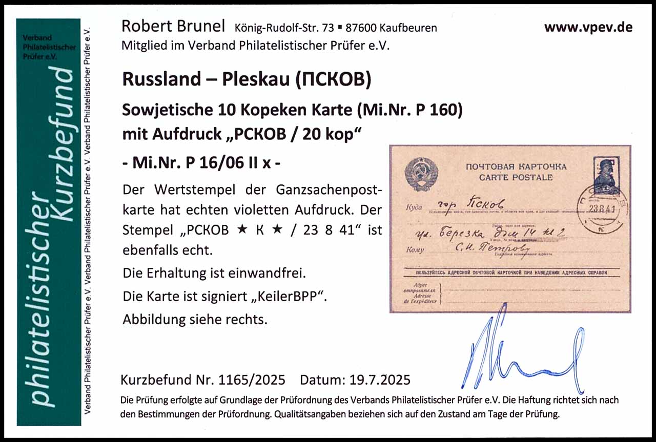 10 Kopecks postal stationery with overprint "Pleskau / 20 kop", with advertising slogan 06 violet hand stamp overprint, addressed and reverse described, cancelled by cancel "PCKOB * K * 23 8 41", sound, photo expertize Robert Brunel VP (2025) "the condition is perfect", expertized Keiler BPP