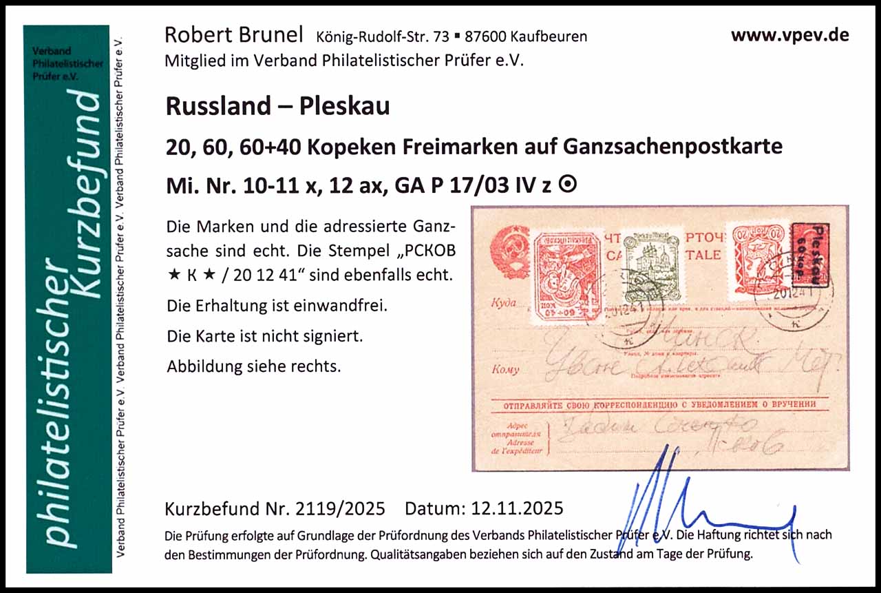20 Kopecks postal stationery postcard with black overprint "Pleskau 60 kop", with Werbespruch03, with additional franking Pleskau Michel number 10-11 x and 12 crossed, overfranked, cancelled by cancel "PCKOB * K * 20 12 41", sound, photo expertize Robert Brunel VP (2025), "the condition is perfect