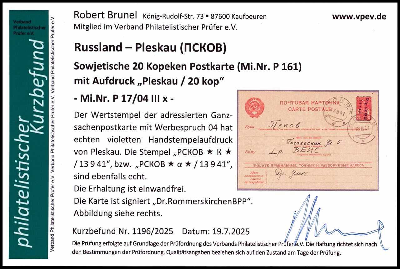 20 Kopecks postal stationery with overprint "Pleskau / 20 kop", with advertising slogan 04, violet hand stamp overprint, addressed, cancelled by cancel "PCKOB * a * 13 9 41", very fine, expertized Dr. Rommerskirchen BPP, photo expertize Robert Brunel VP (2025), "the condition is perfect