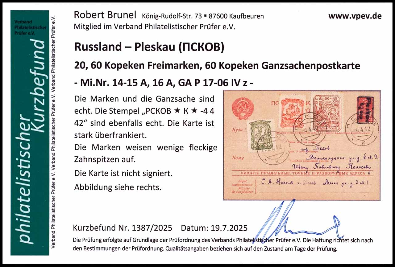 20 Kopecks postal stationery with overprint "Pleskau / 60 kop", with advertising slogan 06, black hand stamp overprint, with additional franking, Pleskau Michel number 14-15 A and Michel number 16 A, cancelled "PCKOB * K * -4 4 42", the card is overfranked, the stamps wise few spotty perf tips on, photo expertize Robert Brunel VP (2025)