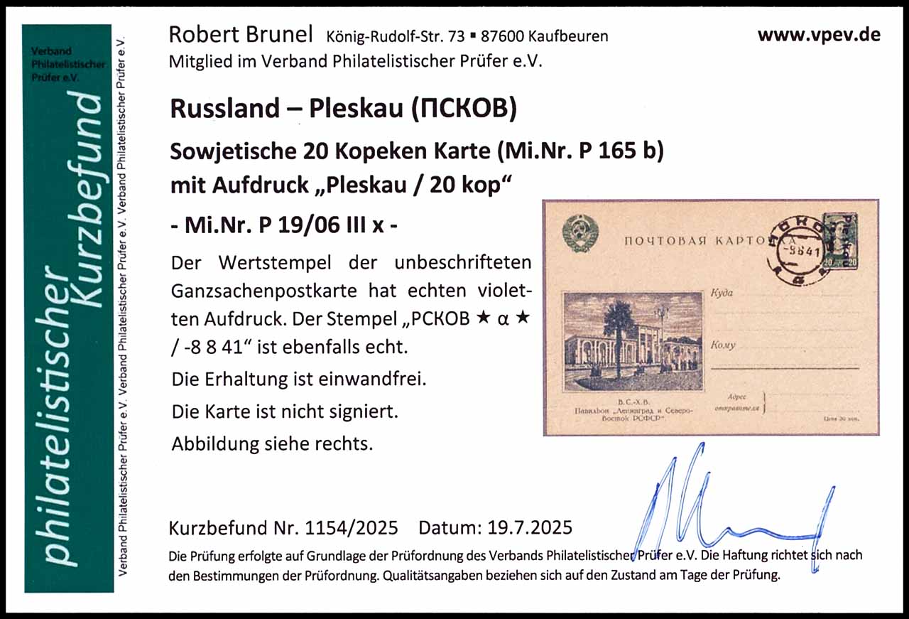 20 Kopecks postal stationery with overprint "Pleskau / 20 kop", with picture 06, violet hand stamp overprint, blanco card, cancelled by black cancel "PCKOB * a * -8 8 41", photo expertize Robert Brunel VP (2025), "the condition is perfect