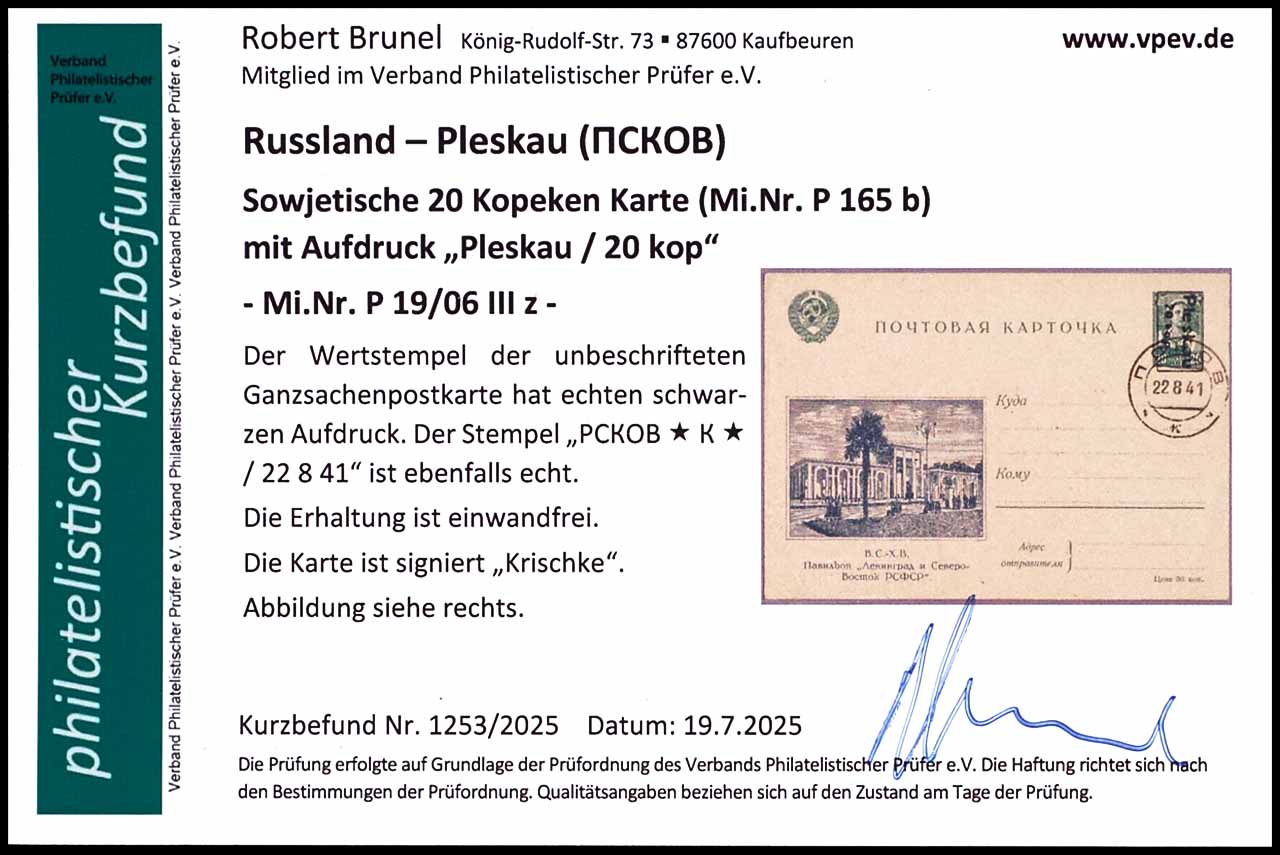 20 Kopecks postal stationery with overprint "Pleskau / 20 kop", with picture 06, black hand stamp overprint, blanco card, cancelled by black cancel "PCKOB * a * -22 8 41", expertized Krischke, photo expertize Robert Brunel VP (2025), "the condition is perfect