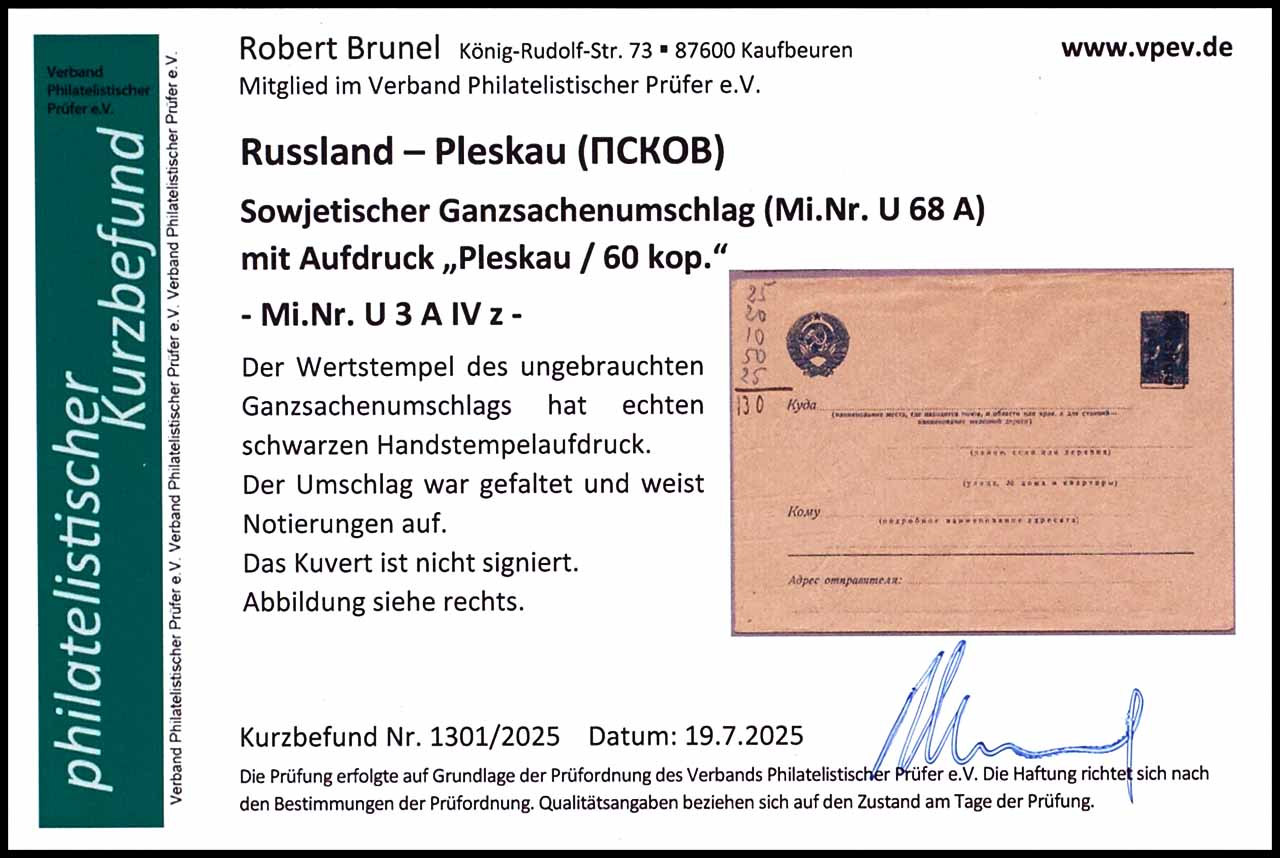 30 Kopecks postal stationery cover with overprint "Pleskau / 60 kop", black hand stamp overprint, unused, cover was folded with front page quotations, photo expertize Robert Brunel VP (2025)