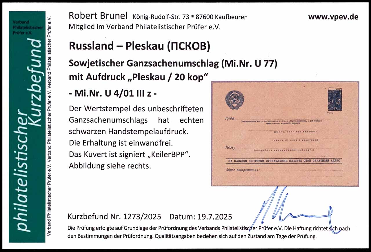 30 Kopecks postal stationery cover with overprint "Pleskau / 20 kop", black hand stamp overprint, unused, with advertising slogan 01, reverse sound, expertized Keiler BPP, photo expertize Robert Brunel VP (2025) "the condition is perfect.