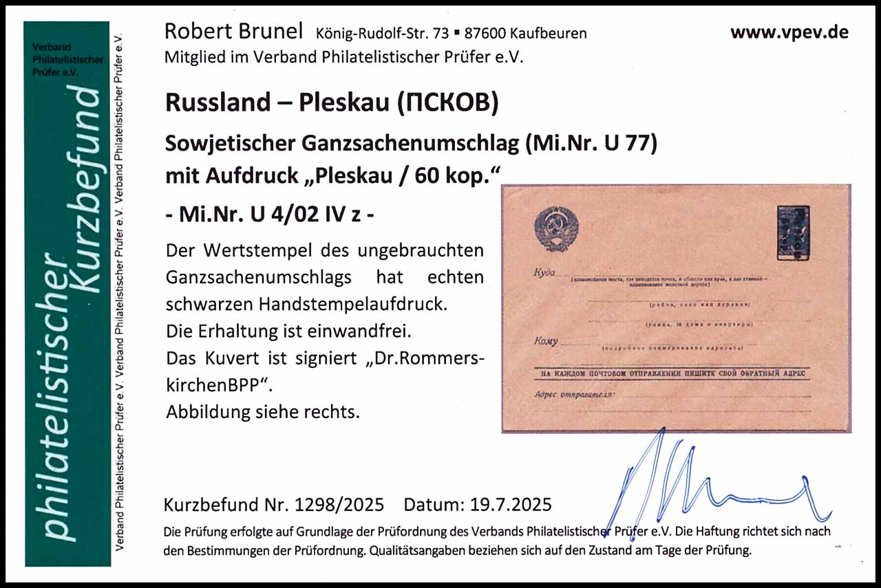 30 Kopecks postal stationery cover with overprint "Pleskau / 60 kop", black hand stamp overprint, unused, with advertising slogan 02, very fine, expertized Dr. Rommerskirchen BPP, photo expertize Robert Brunel VP (2025) "the condition is perfect.