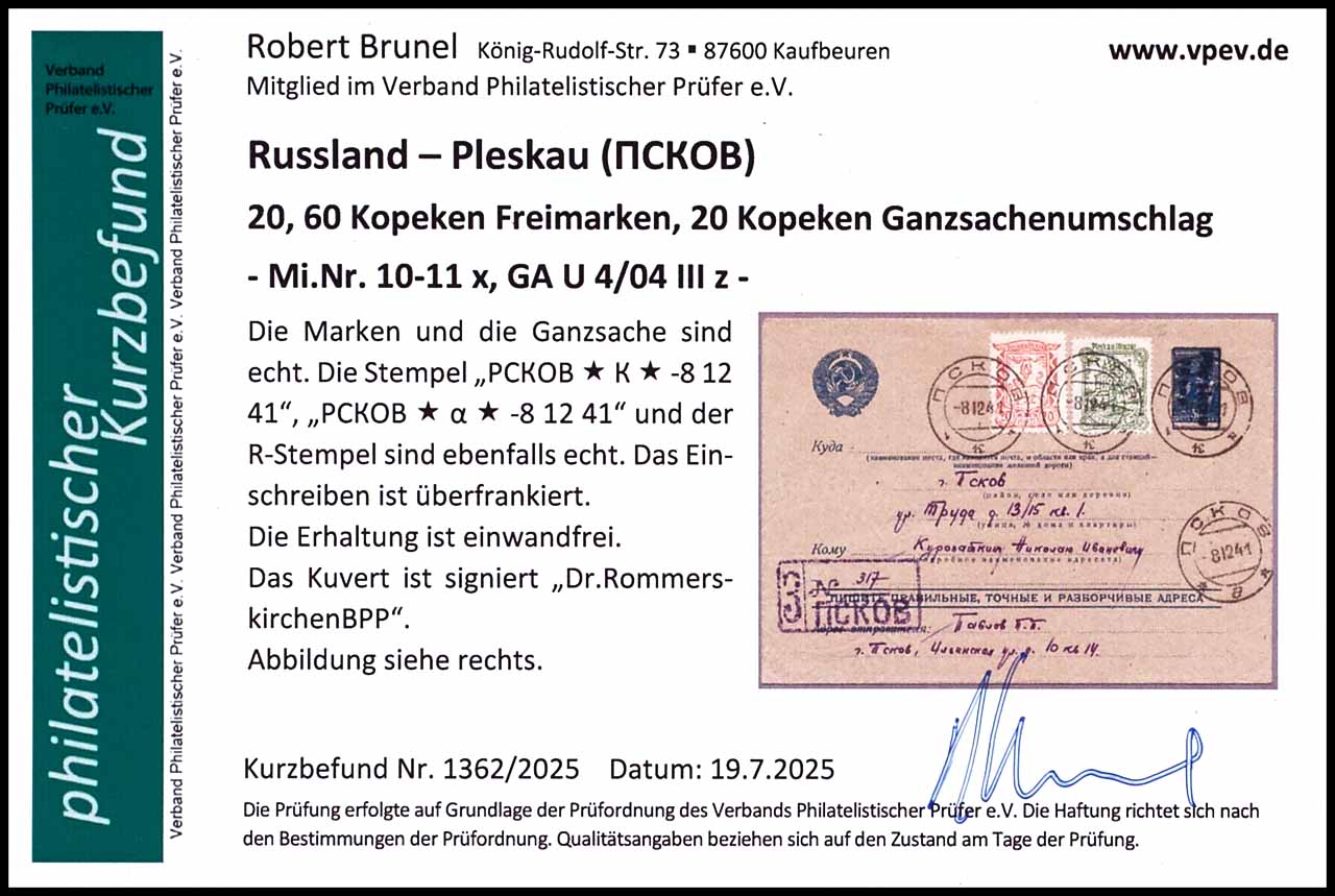 30 Kopecks registered postal stationery cover with overprint "Pleskau / 20 kop", black hand stamp overprint, with advertising slogan 04, with additional franking Pleskau Michel number 10 x and 11 x, cancelled by cancel "PCKOB * K * -8 12 41" and "PCKOB * a * -8 12 41", the registered postal stationery cover is overfranked, very fine, expertized Dr. Rommerskirchen BPP, photo expertize Robert Brunel VP (2025) "the condition is perfect