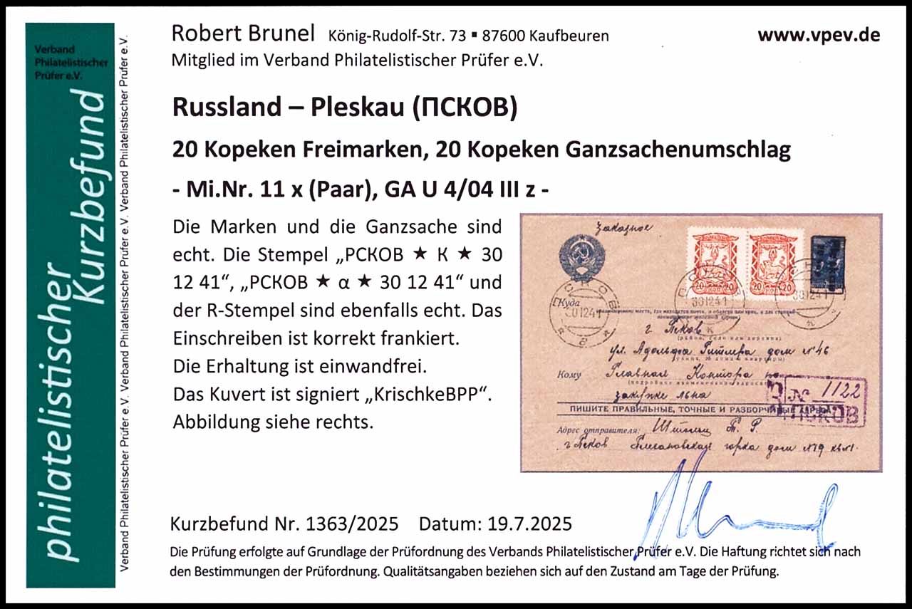30 Kopecks registered postal stationery cover with overprint "Pleskau / 20 kop", black hand stamp overprint, with advertising slogan 04, with additional franking Pleskau Michel number 11 x (2) horizontal pair, cancelled by cancel "PCKOB * K * 30 12 41" and "PCKOB * a * 30 12 41", the registered postal stationery cover is correct franked, very fine, expertized Krischke BPP, photo expertize Robert Brunel VP (2025) "the condition is perfect