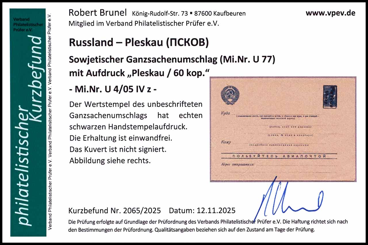 30 Kopecks postal stationery cover with black overprint" Pleskau 60 kop", unused, Werbespruch05, sound, photo expertize Robert Brunel VP (2025) "the condition is perfect", Michel 50.-