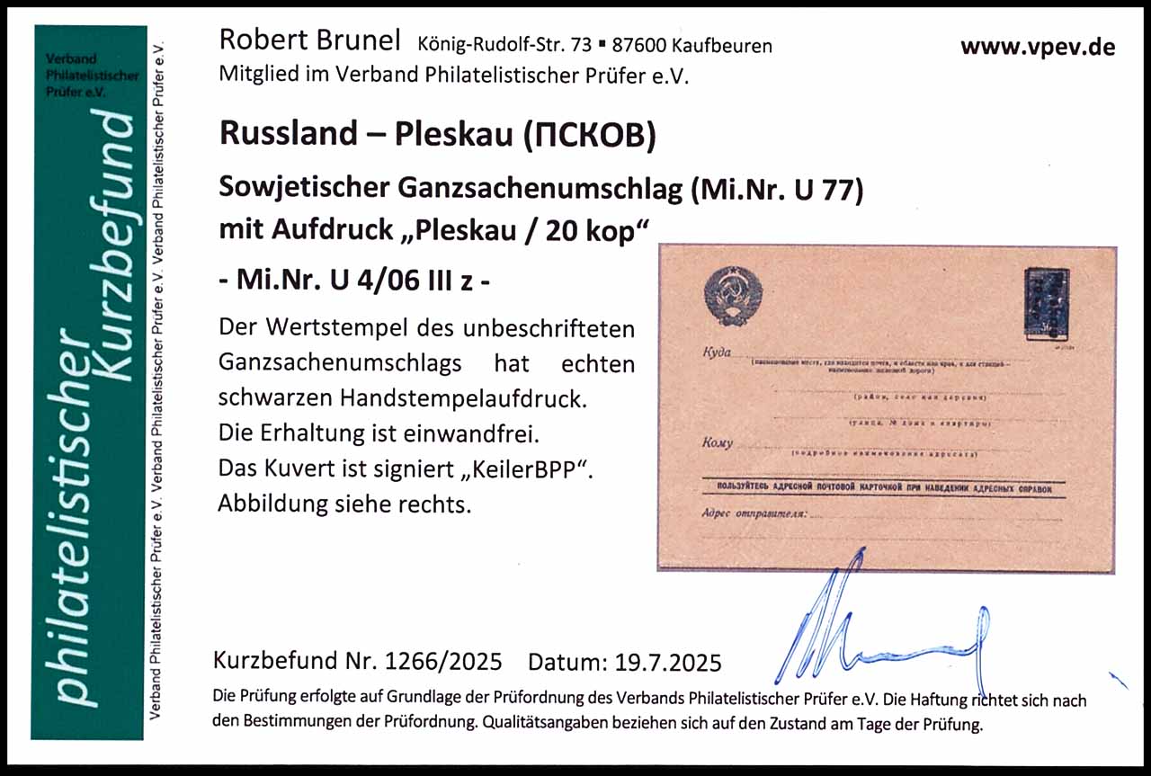 30 Kopecks postal stationery cover with overprint "Pleskau / 20 kop", black hand stamp overprint, with advertising slogan 06, very fine, expertized Keiler BPP, photo expertize Robert Brunel VP (2025) "the condition is perfect.
