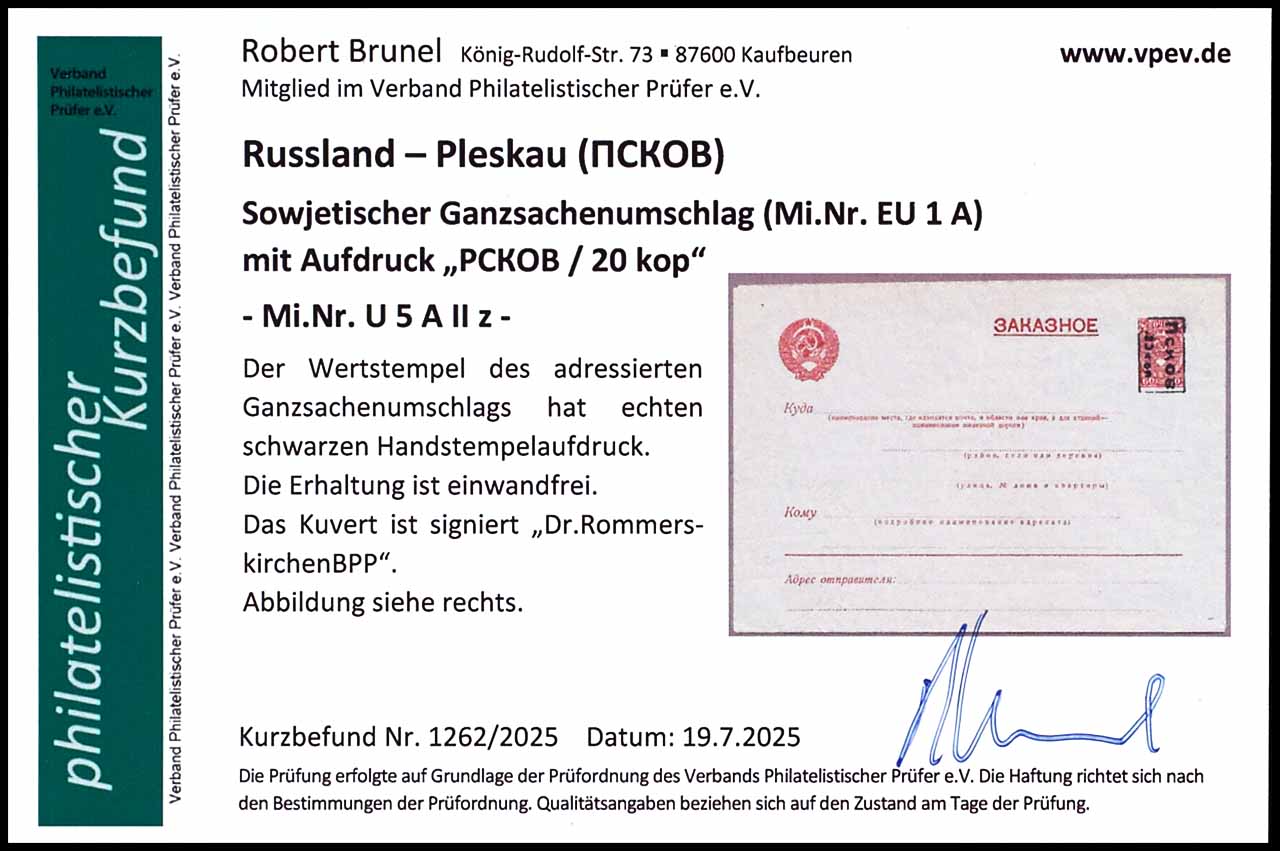 60 Kopecks postal stationery cover with overprint "PCKOB / . 20 kop", black hand stamp overprint, very fine, photo expertize Robert Brunel VP (2025) "the condition is perfect
