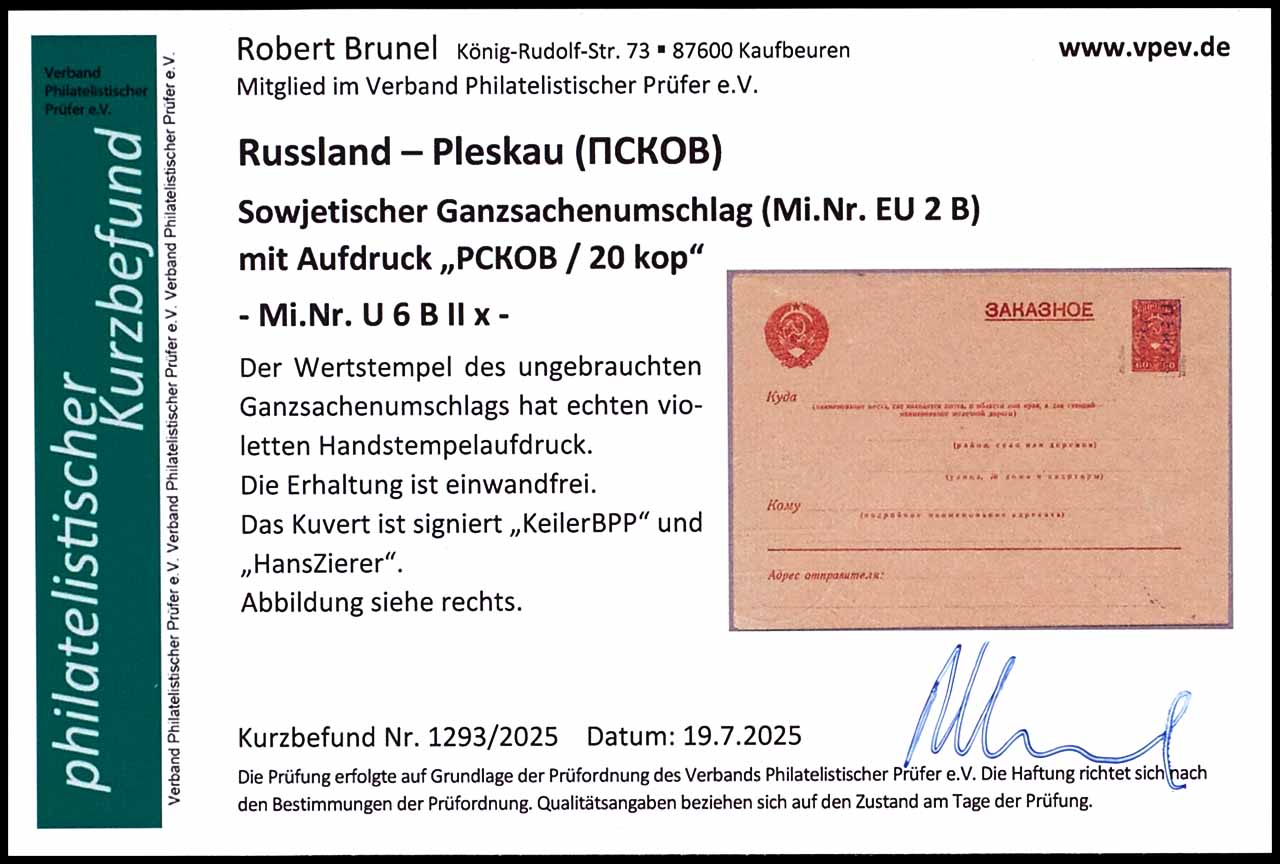 60 Kopecks postal stationery cover with overprint "PCKOB / 20 kop", violet hand stamp overprint, unused, very fine, photo expertize Robert Brunel VP (2025) "the condition is perfect", expertized Keiler BPP and Hans Zierer