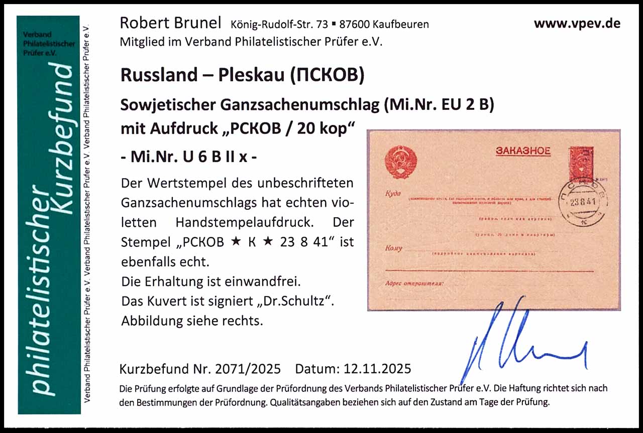 60 Kopecks postal stationery cover with black overprint" PCKOB 20 kop", blank cover, cancelled by cancel "PCKOB * K * 23 8 41, sound, expertized Dr. Schultz, photo expertize Robert Brunel VP (2025) "the condition is perfect