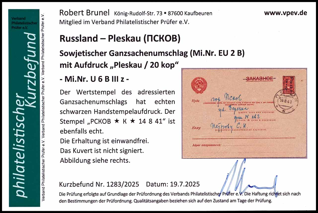 60 Kopecks postal stationery cover with overprint "Pleskau / 20 kop", black hand stamp overprint, addressed, cancelled "PCKOB * K * 14 8 41", very fine, photo expertize Robert Brunel VP (2025) "the condition is perfect", no signature