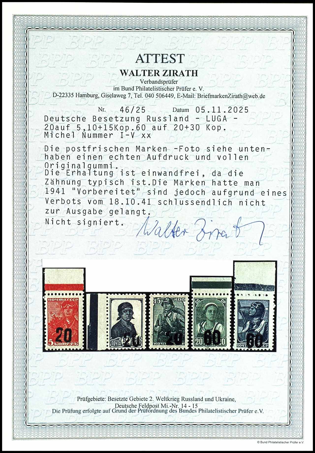 not issued: 20 on 5 Kopecks - 60 on 30 Kopecks workers, complete set, mostly margin copies, prepared however through prohibition from 18.10.1941 not to the issue arrived set, unsigned, photo expertize Walter Zirath (2025) "the condition is perfect, because the perforation is typical. ", Michel 1.100.-