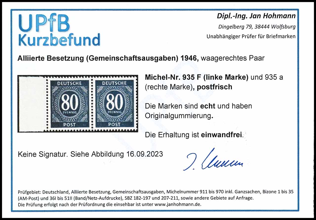 80 pfennigs from left side margin, as well the left stamp with the colour error, sound, abridged certificate certificate -engineer Jan Hohmann (2023), "the condition is perfect", Michel 320.-