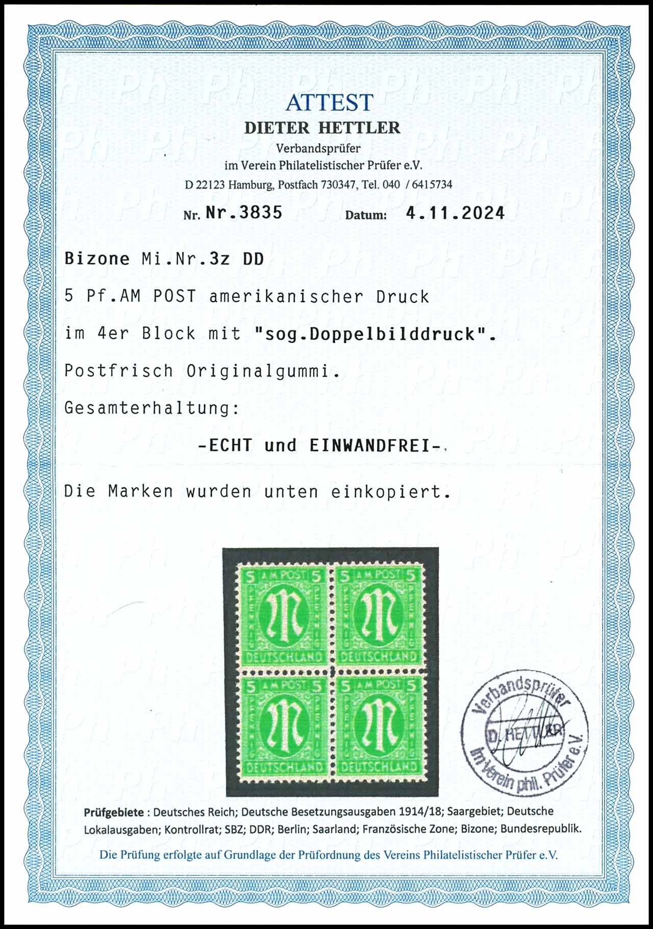 5 pfennigs with double imprint in the sound mint never hinged block of four in unsigned superb condition, photo expertize Dieter Hettler ". perfect