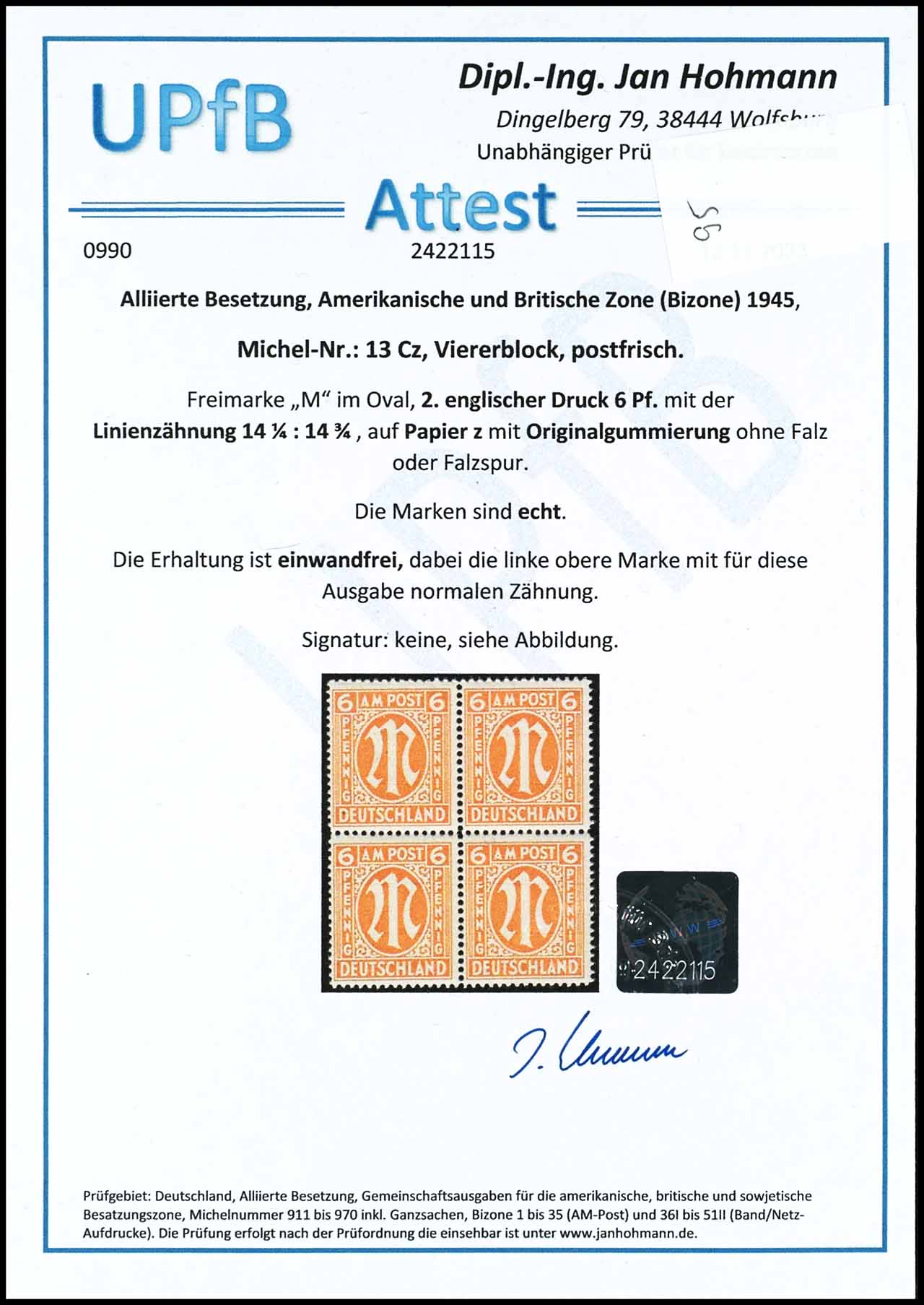 6 pfennigs first issue of stamps for Germany after WW II., english printing in the block of four, mint never hinged, very fine, certificate certificate -engineer Jan Hohmann UPf B (2023), Michel 800.-