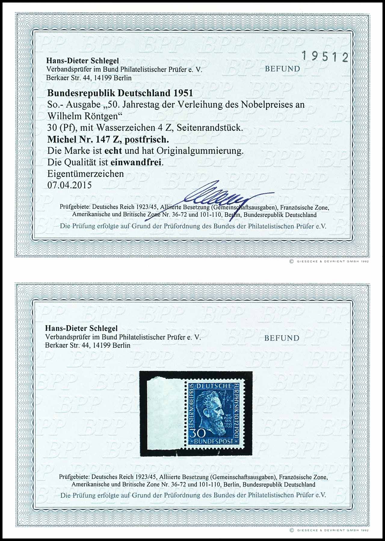 30 pfennigs "50 anniversary the bestowal of the Nobel Prize at Wilhelm Roentgen", watermark 4 Z, mint never hinged, very fine, signed, photo expertize Hans Dieter Schlegel BPP "the quality is perfect. ", Michel 320.-